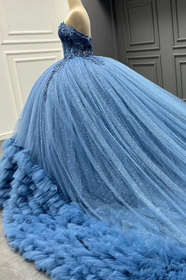 WQ1325 - Vestido de fiesta formal de noche con hombros descubiertos, sin mangas, con apliques de flores 3D, lentejuelas, volantes, tul azul brillante, vestido de quinceañera para dulces 16