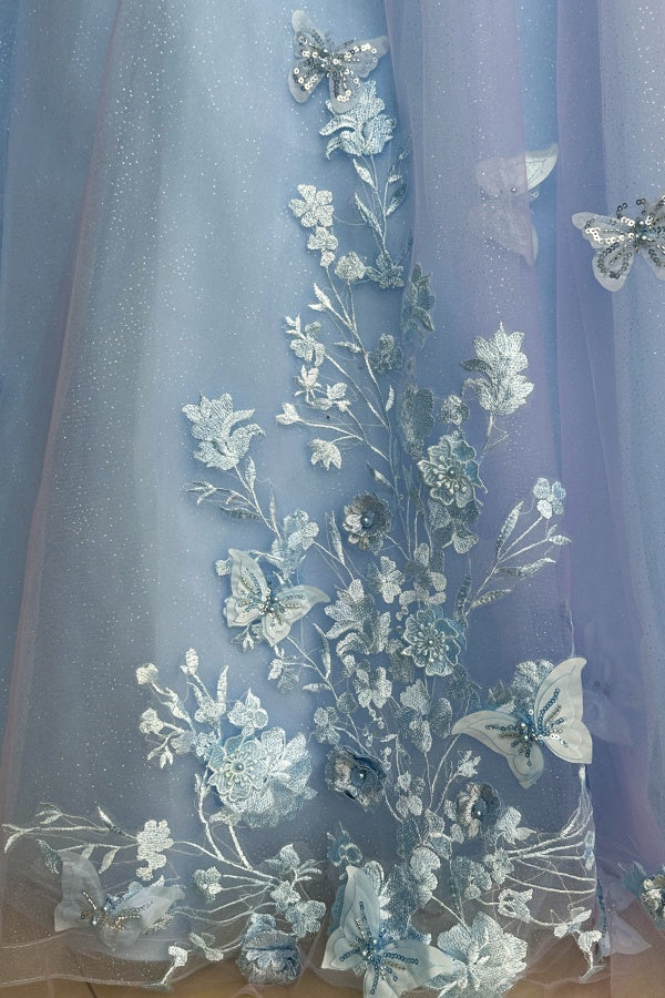 Descripción: Presentamos nuestro impresionante vestido de quinceañera WQ1353, sin mangas y con hombros descubiertos, adornado con delicados apliques florales en 3D. Los detalles de encaje con cuentas le dan un toque de elegancia, mientras que el tul azul cielo y lila crea una atmósfera de ensueño. Perfecto para una quinceañera o cualquier ocasión especial, este vestido te hará sentir como la realeza.