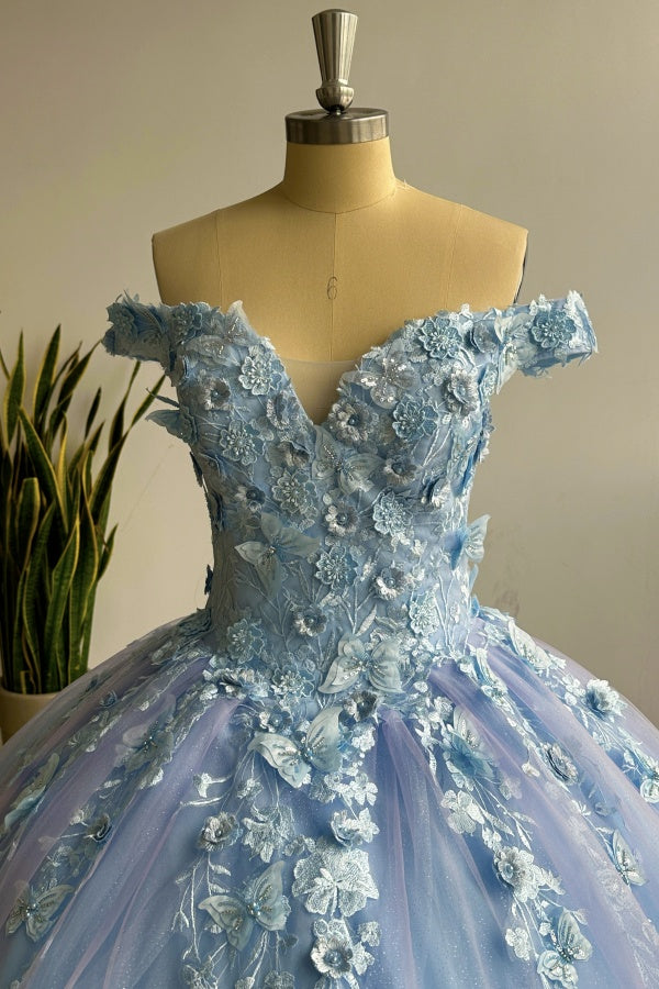 WQ1353 - Vestido de quinceañera de tul azul cielo lila, sin mangas, con hombros descubiertos y apliques de flores 3D, cuentas y cordones, para fiesta de cumpleaños
