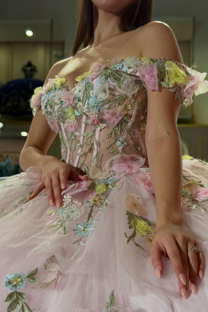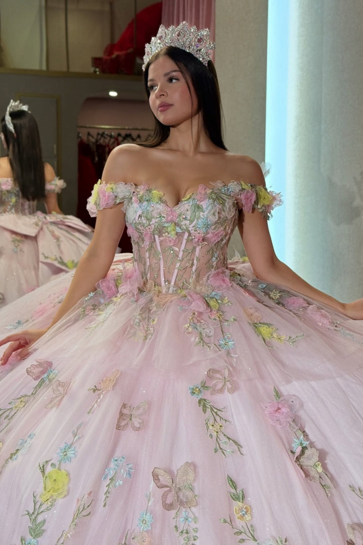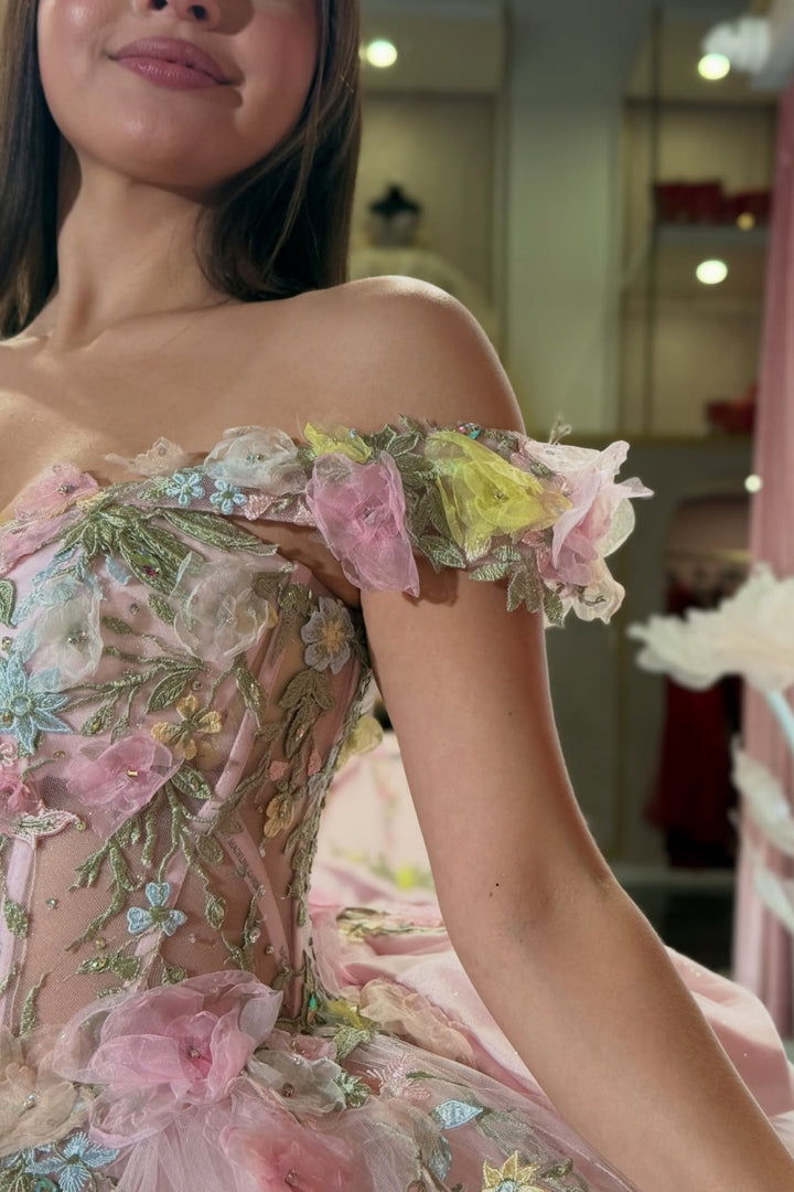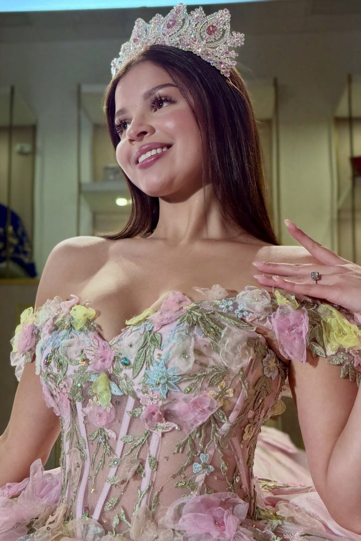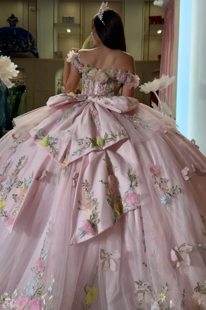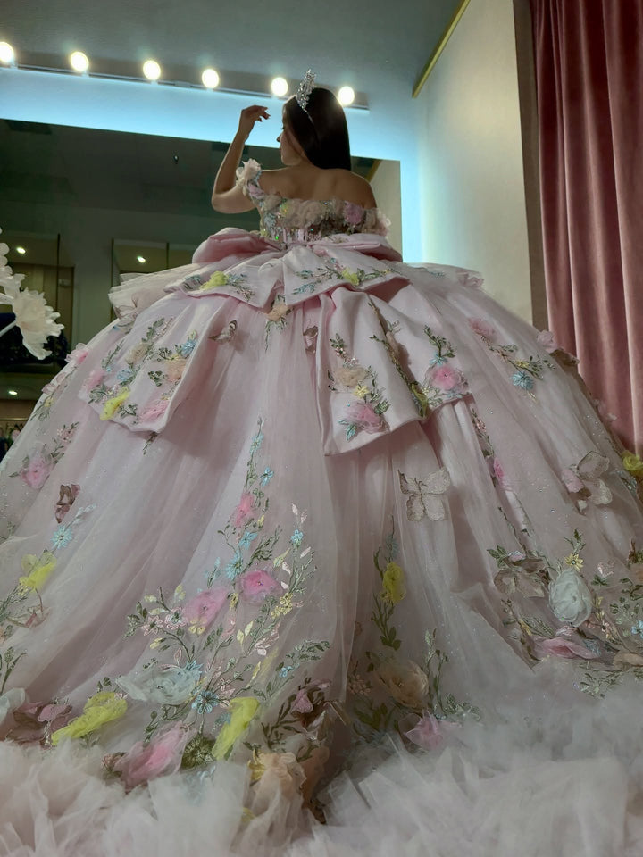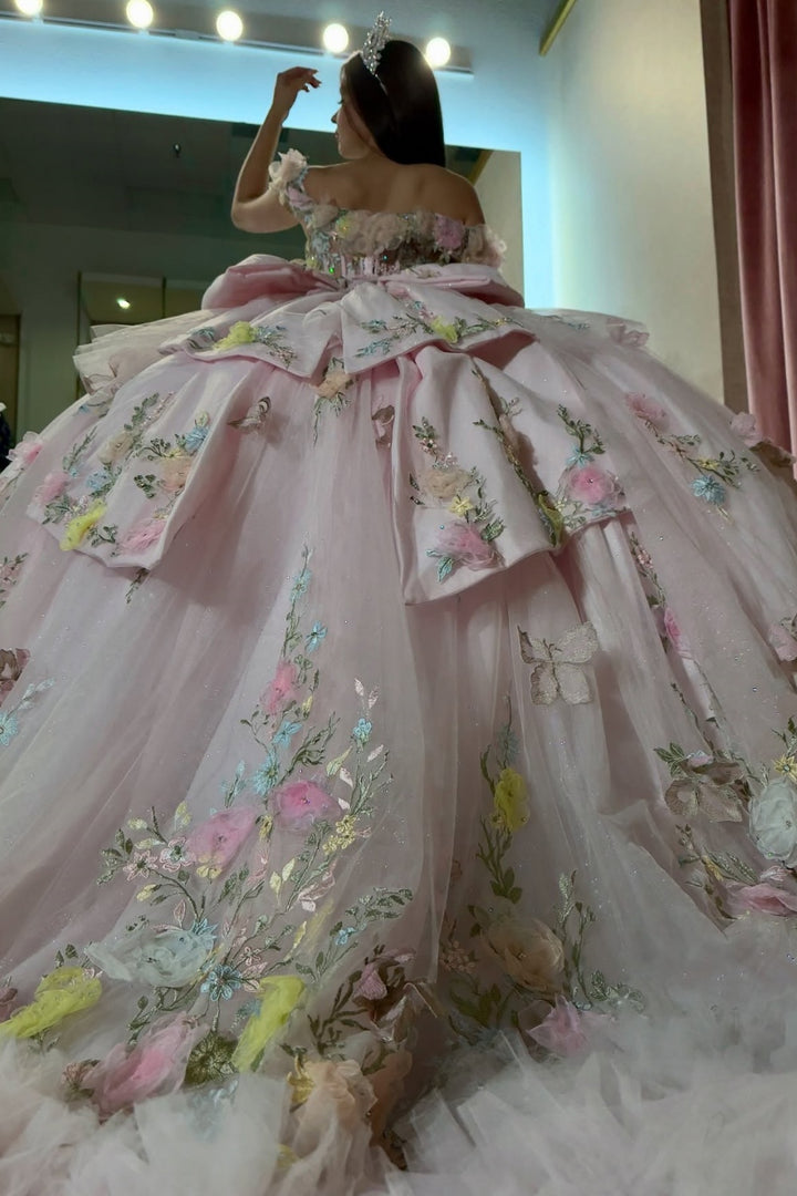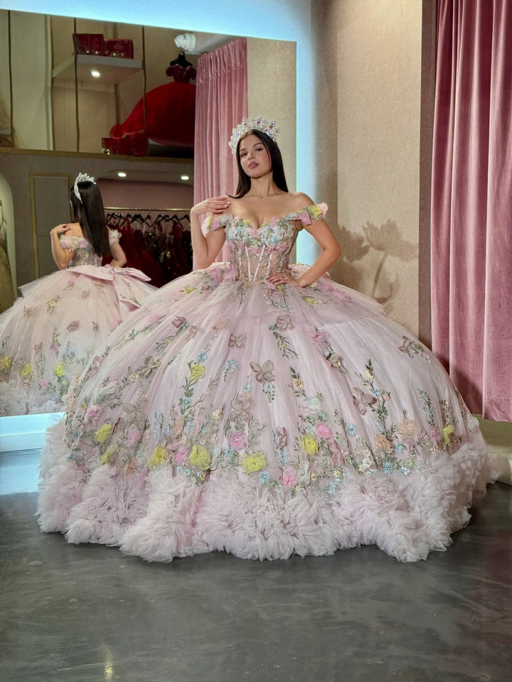 Description: Step into your quinceañera celebration wearing this breathtaking pink gown adorned with dimensional artistry. The off-shoulder, sleeveless silhouette features stunning 3D flower appliqués that create striking visual depth and texture. Layered ruffles add romantic movement and volume, while a delicate bow knot accent completes the enchanting design. This masterfully crafted dress combines intricate embellishment with flattering proportions, allowing you to feel confident, elegant, and absolutely radiant as you mark this transformative milestone.