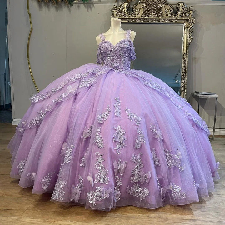 Descripción: Este elegante y bonito vestido de fiesta es perfecto para cualquier fiesta de quinceañera. Su diseño con hombros descubiertos es elegante y la aplicación de encaje le da un toque de elegancia. Los detalles de cuentas y los volantes escalonados lo hacen verdaderamente único. Hecho con tul lila, este vestido es digno de una princesa.