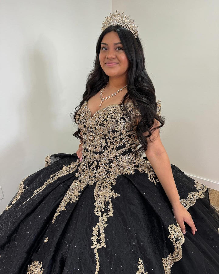 WQ1233 - Vestido de fiesta clásico con hombros descubiertos, apliques de encaje y volantes escalonados, tul negro, vestido de princesa con hombros descubiertos para quinceañera, vestido para dulces 16