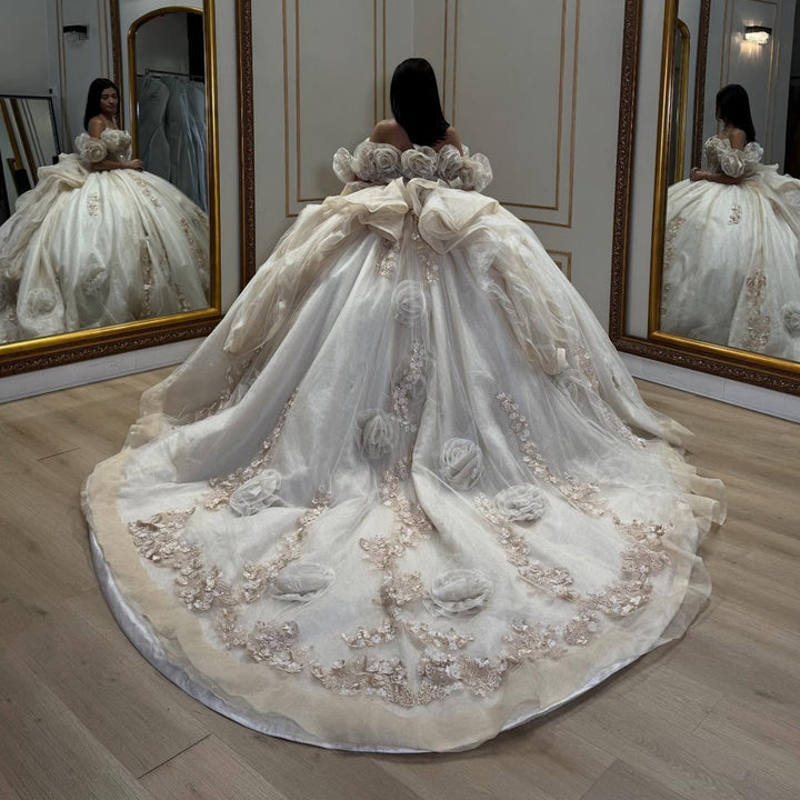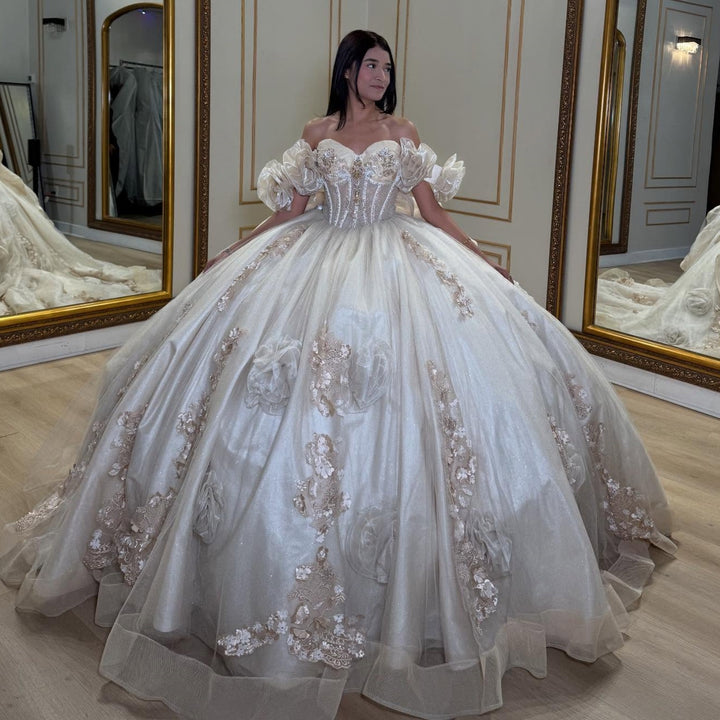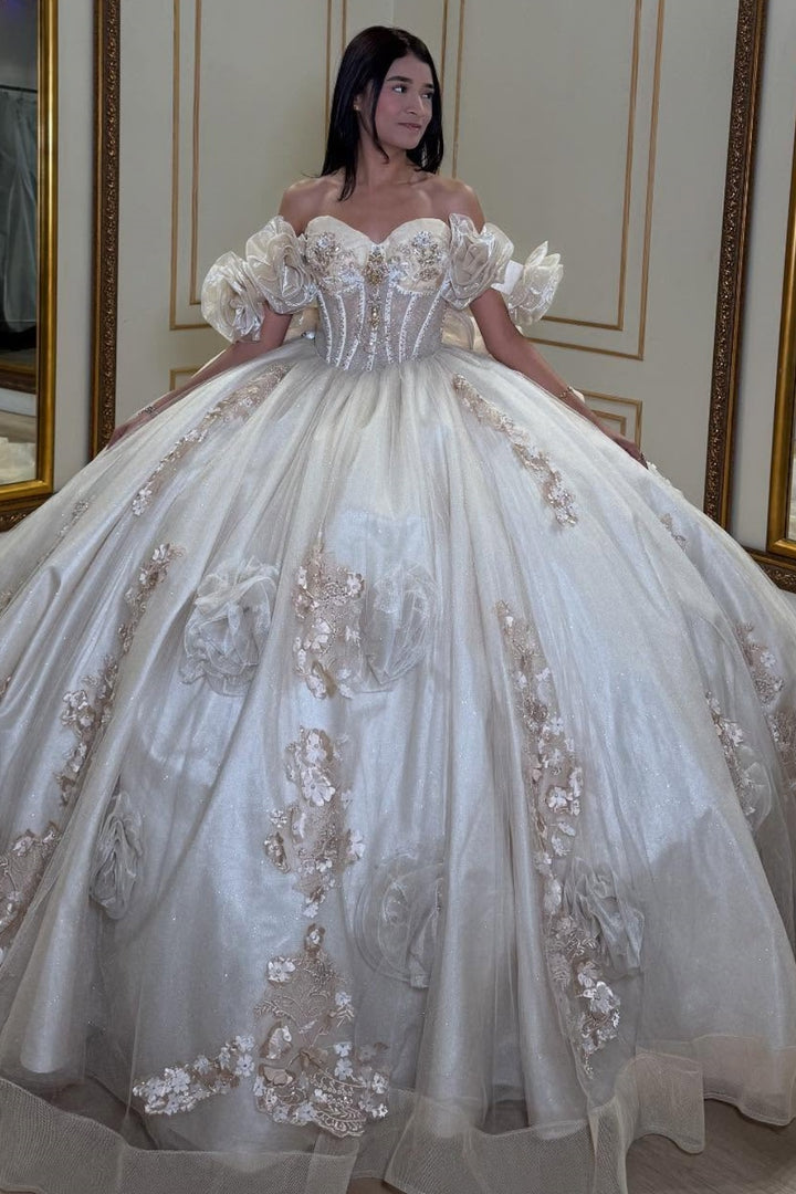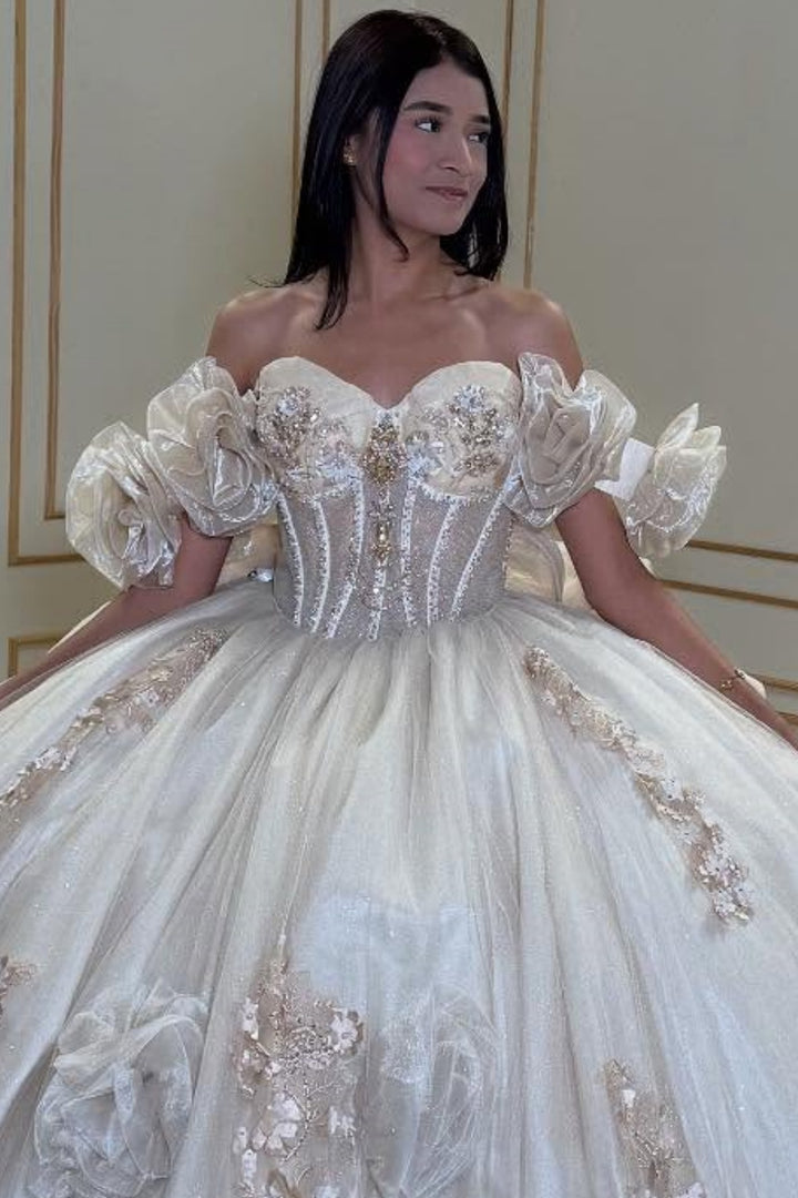 Description: Celebrate your Sweet 15 in timeless sophistication with this pristine white quinceañera gown. The off-shoulder neckline and sleeveless design offer a modern, romantic aesthetic, while dimensional 3D flower appliques adorned with beading create stunning visual depth. A charming bow knot accent completes this exquisite ensemble, delivering the perfect balance of classic elegance and contemporary flair for your milestone celebration.