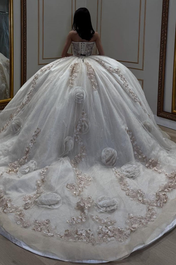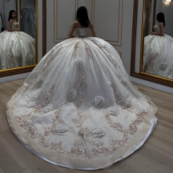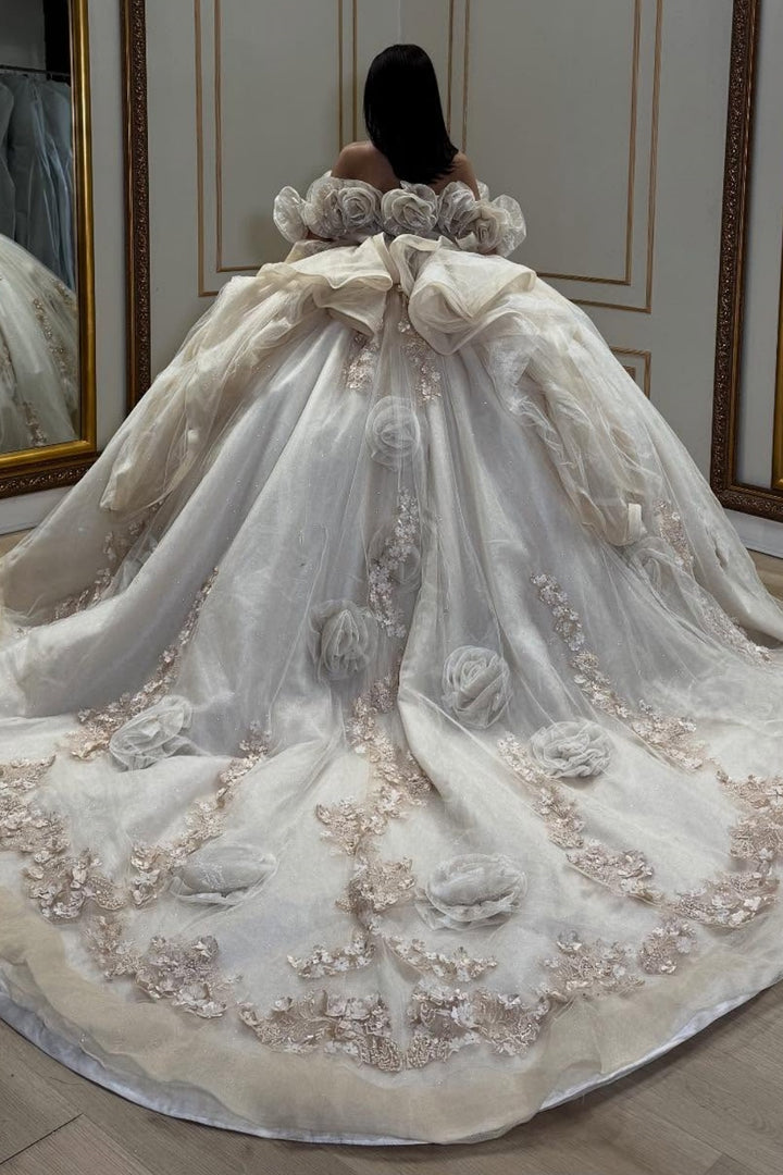 Off Shoulder Sleeveless Beaded 3D Flower Appliques Bow Knot White Sweet 15 Quinceañera Dress WQ1693