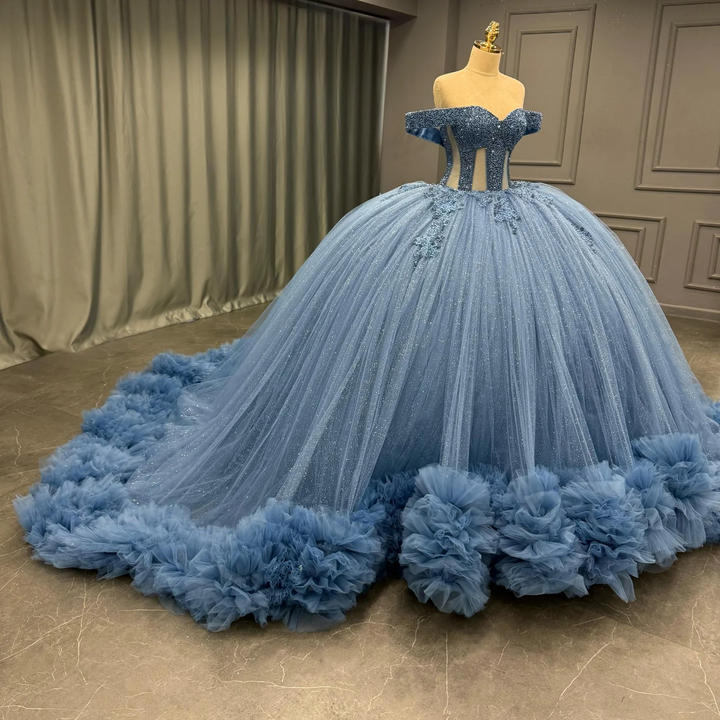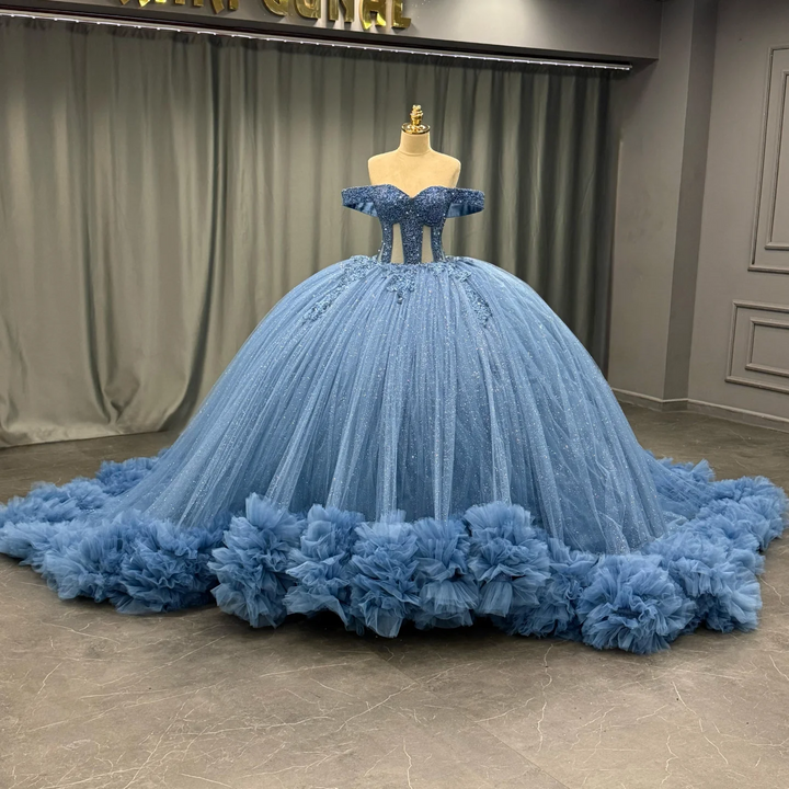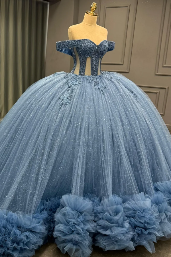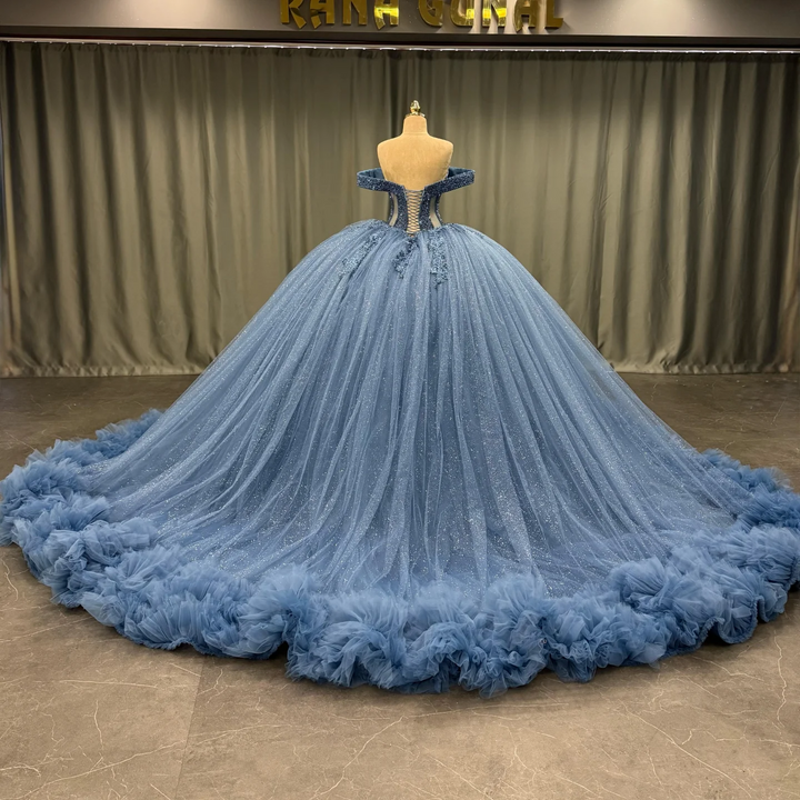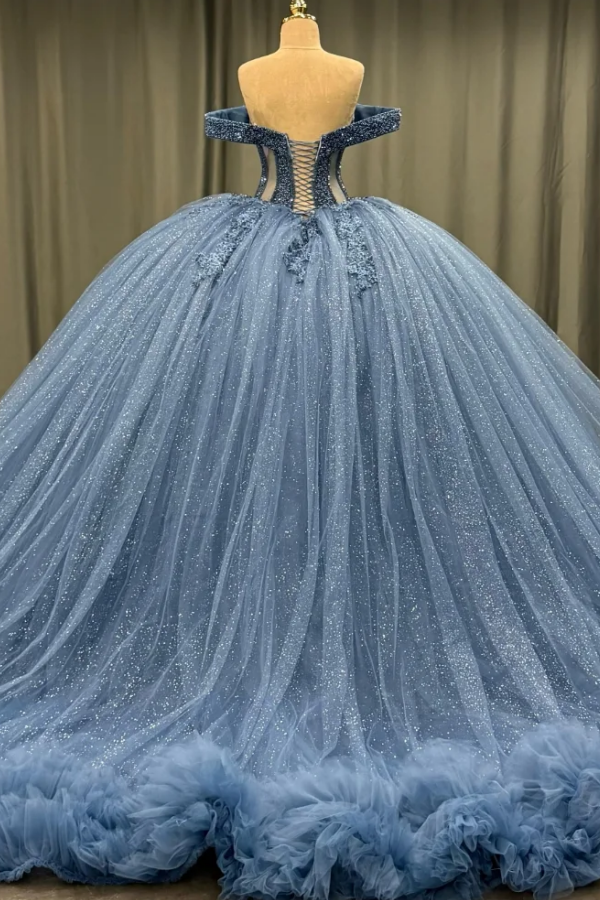 WQ1387 - Vestido de quinceañera de tul azul brillante, sin mangas, con hombros descubiertos, apliques de cuentas, plisado y con cordones, vestido formal de noche para dulces 16.
