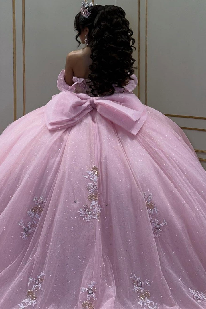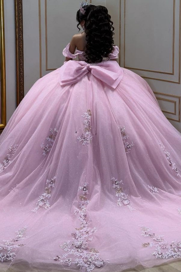 Off Shoulder Sleeveless Beaded Appliques Bow Knot Pink Sweet 15 Quinceañera Dress WQ1717