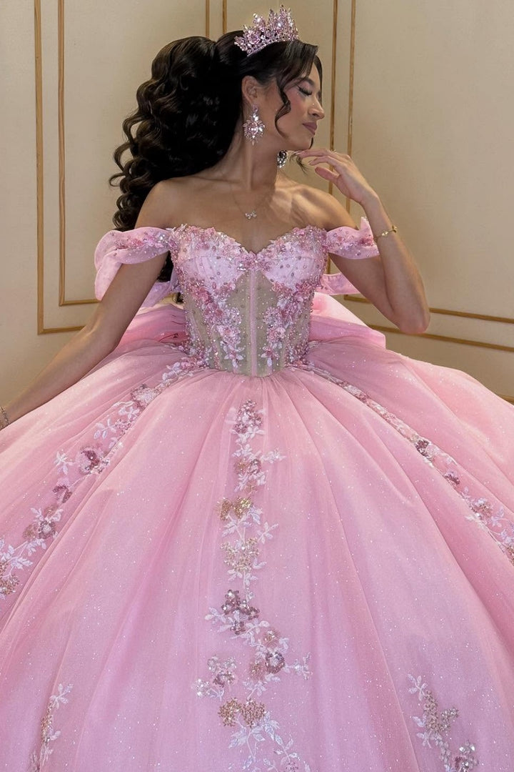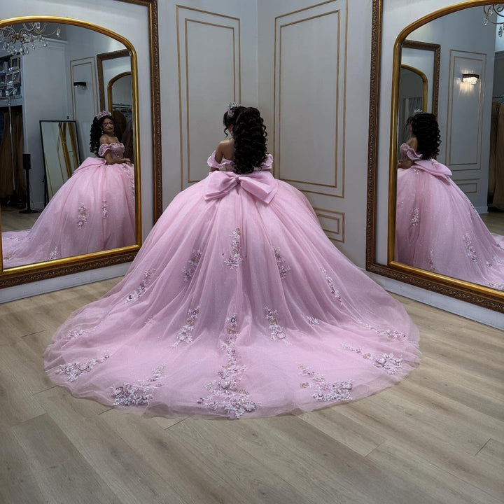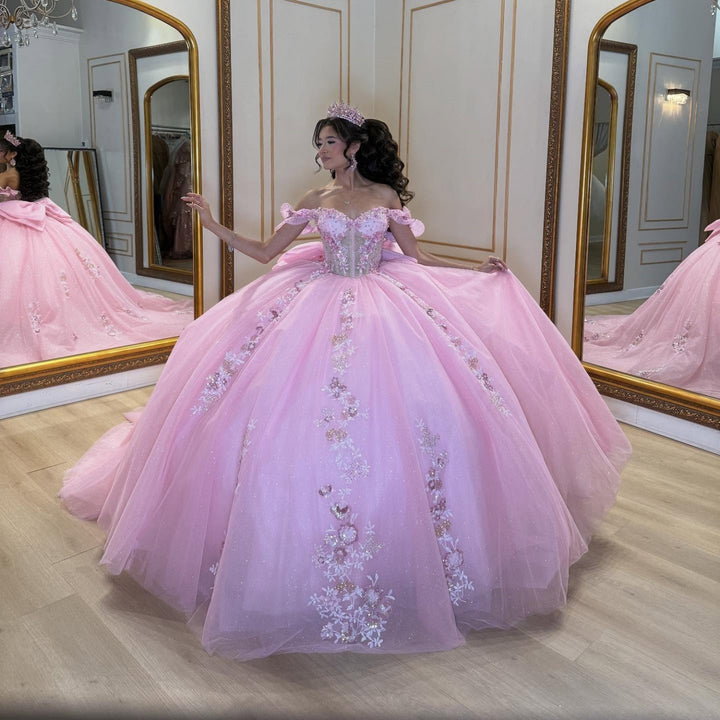Description: Embrace your quinceañera moment in this stunning pink dress that combines contemporary style with timeless sophistication. The graceful off-shoulder neckline and sleeveless silhouette create an alluring, refined look that flatters beautifully. Exquisite beaded appliques are strategically placed to add luxurious sparkle and visual interest, while a charming bow knot detail serves as an elegant focal point. This expertly designed gown strikes the perfect balance between youthful femininity and mature elegance, ensuring you command attention and feel absolutely confident as you celebrate this transformative milestone.