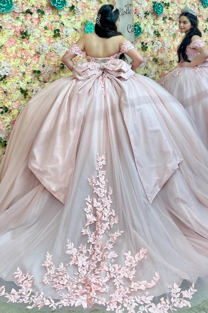 Description: Radiate elegance and poise in this refined quinceañera dress, designed for the modern debutante. Featuring an off-shoulder neckline that frames the face beautifully, this sleeveless gown combines delicate beadwork with sophisticated appliqué detailing. A charming bow knot accent adds a touch of feminine grace, while the soft pink palette conveys youthful romance and timeless beauty. The meticulous craftsmanship ensures every stitch reflects quality and attention to detail, creating a dress that feels as luxurious as it looks. This is the perfect choice for celebrating your transition into womanhood with understated sophistication and undeniable charm.