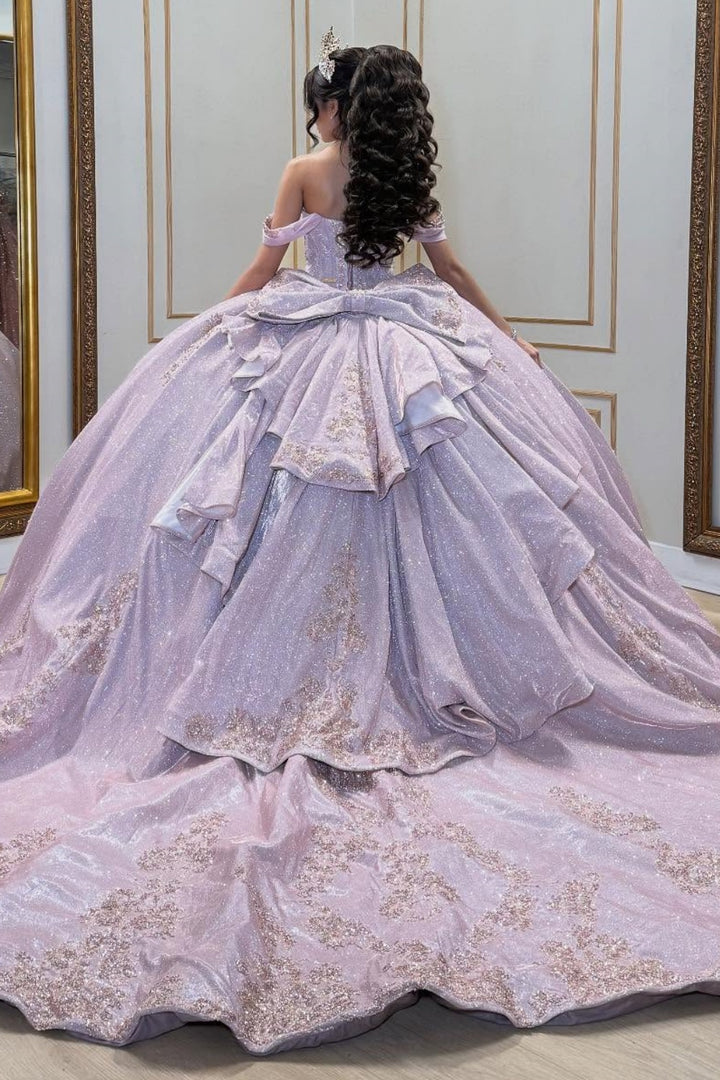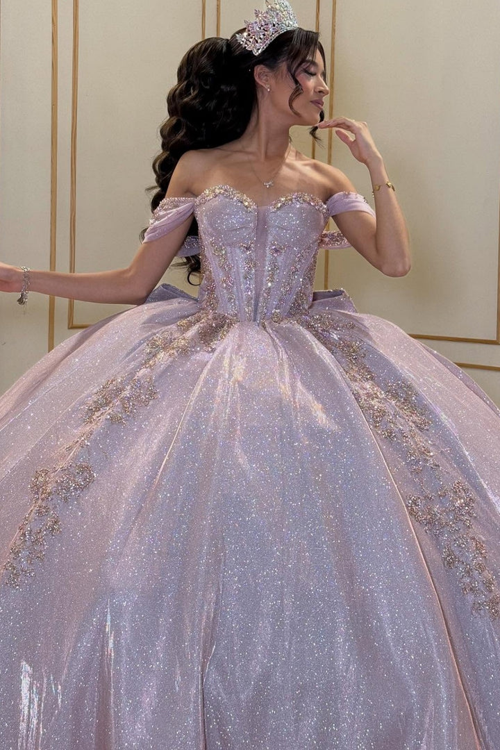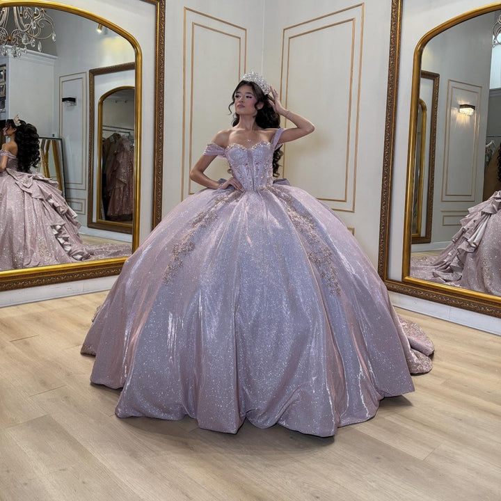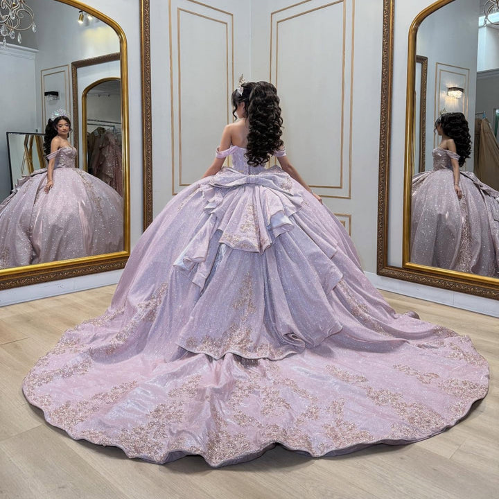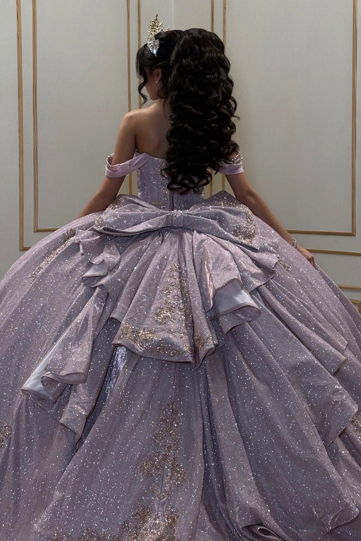 Description: Radiate ethereal beauty in this enchanting lilac quinceañera gown that captures the magic of your special celebration. The sophisticated off-shoulder neckline paired with a sleeveless design creates an elegant, contemporary silhouette that exudes confidence. Meticulously crafted beaded appliques shimmer across the bodice, while romantic ruffles add dimension and graceful movement throughout. A refined bow knot accent completes the look with understated sophistication. This masterfully designed dress perfectly embodies the transition from girlhood to womanhood, allowing you to feel poised, radiant, and absolutely unforgettable on your milestone evening.