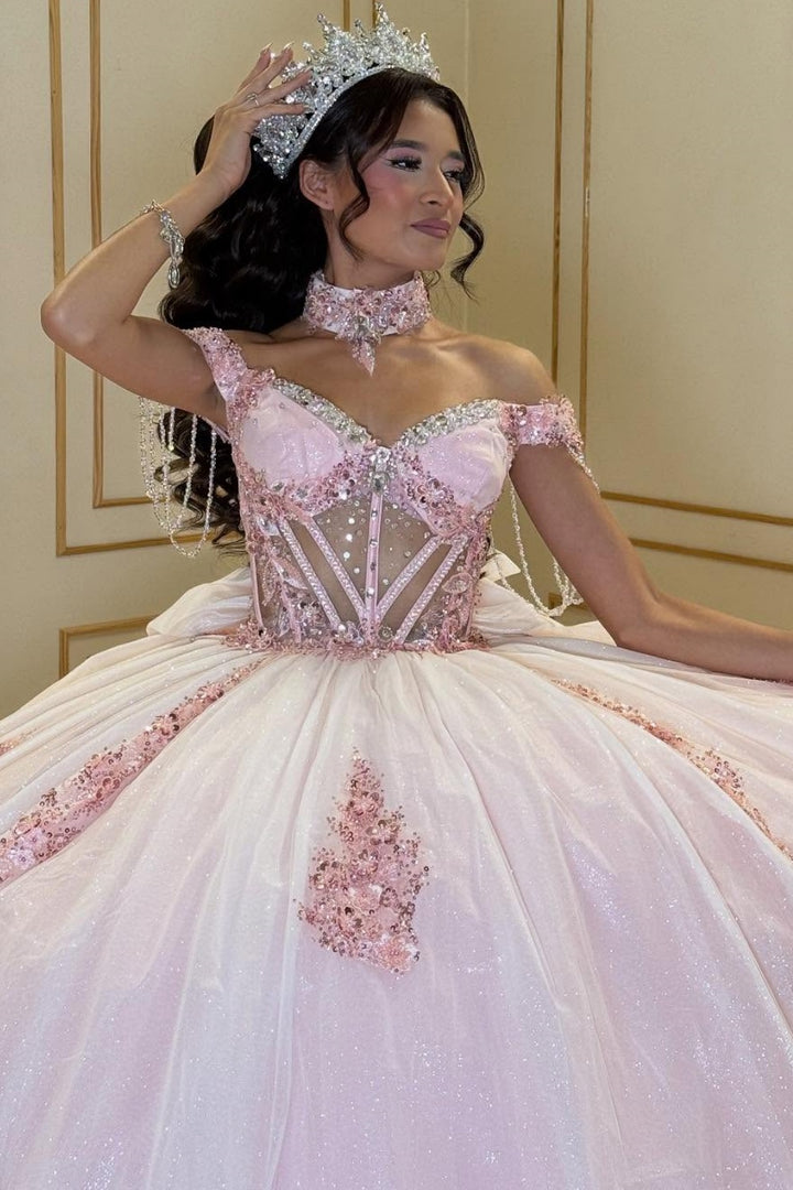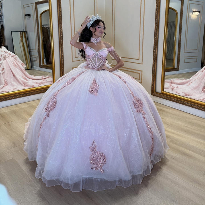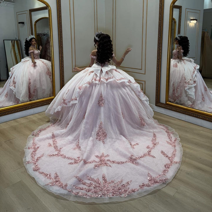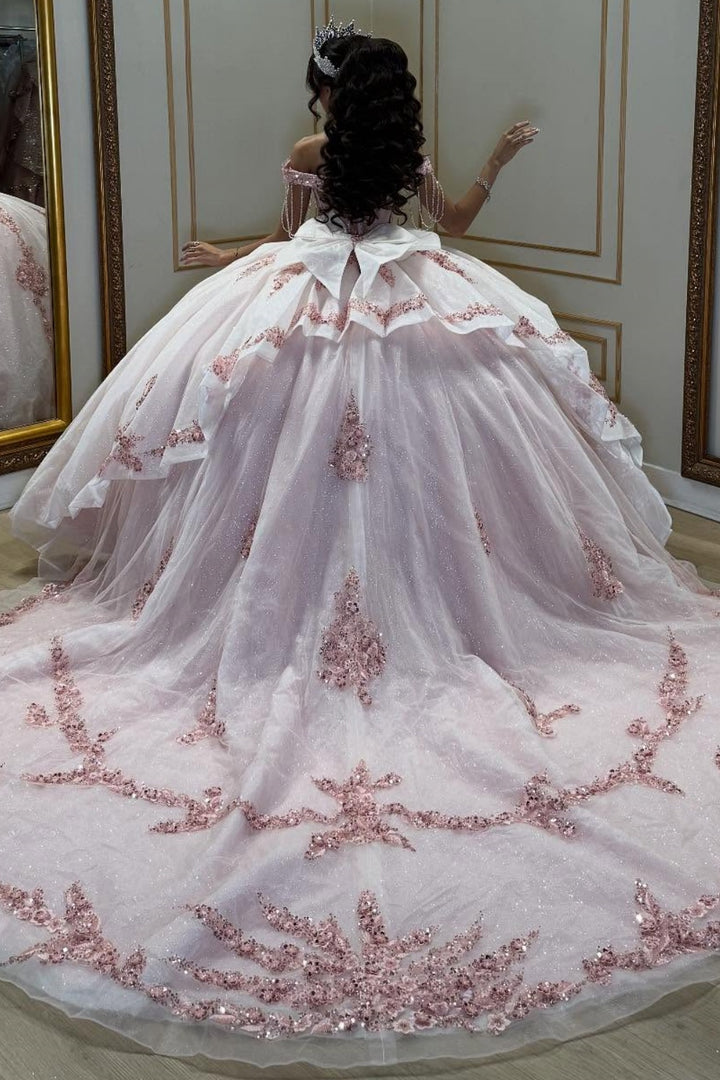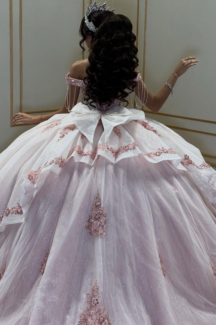 Description: Make your quinceañera unforgettable in this exquisite pink gown designed to capture the essence of your special day. The off-shoulder neckline and sleeveless cut showcase an elegant silhouette, while meticulously placed beaded appliques add luxurious sparkle and dimension. Cascading ruffles create romantic movement and texture, complemented by a graceful bow knot accent. This masterfully crafted dress balances youthful charm with sophisticated refinement, ensuring you radiate confidence and beauty throughout your celebration. An investment in a memory you'll cherish for a lifetime.
