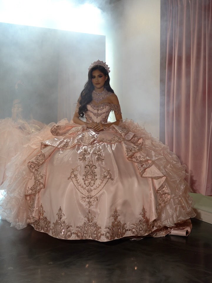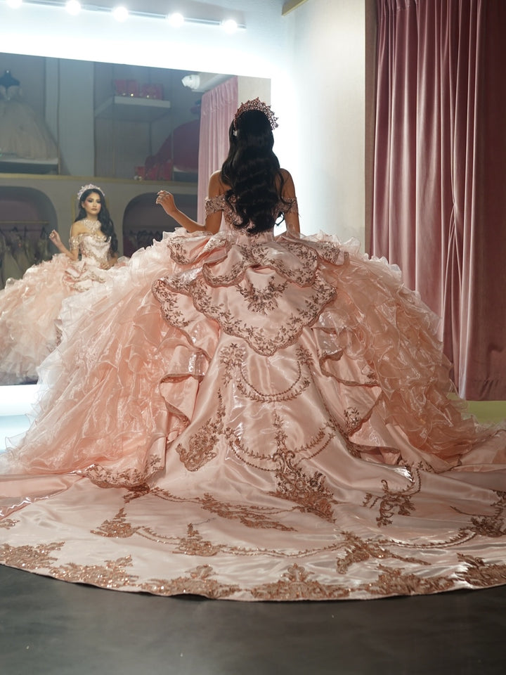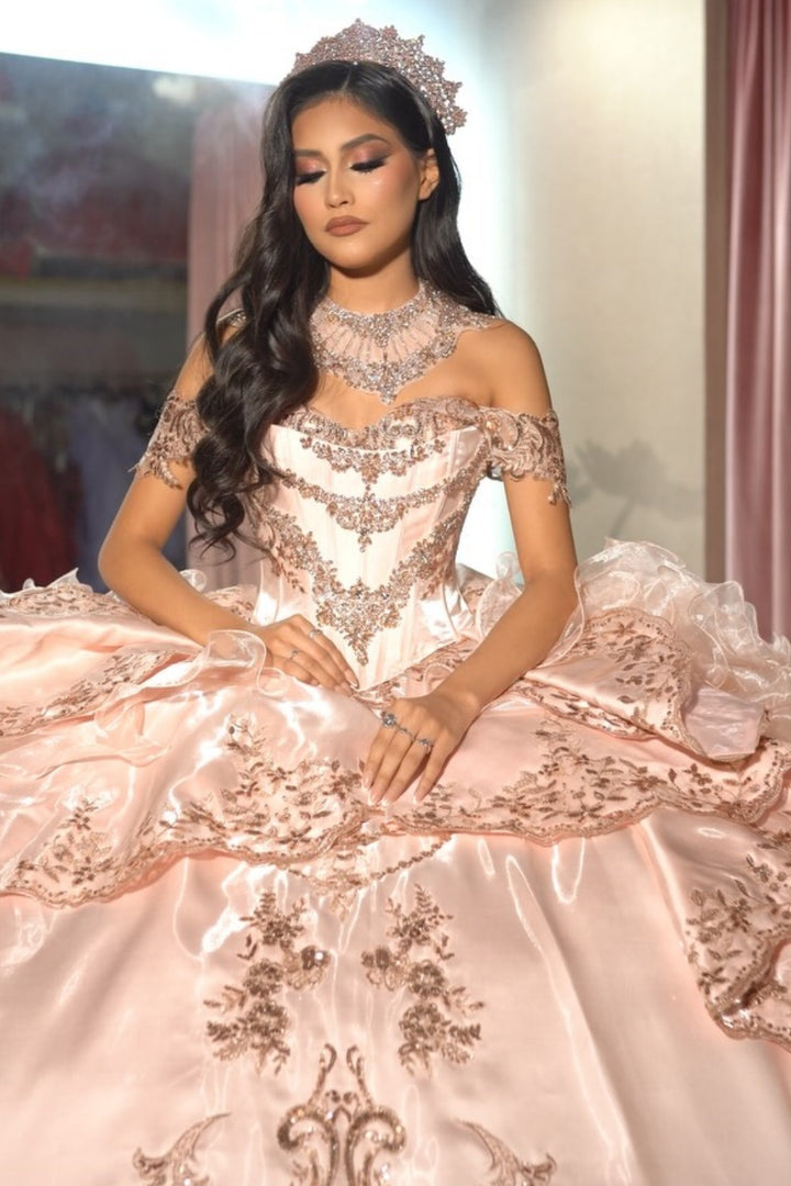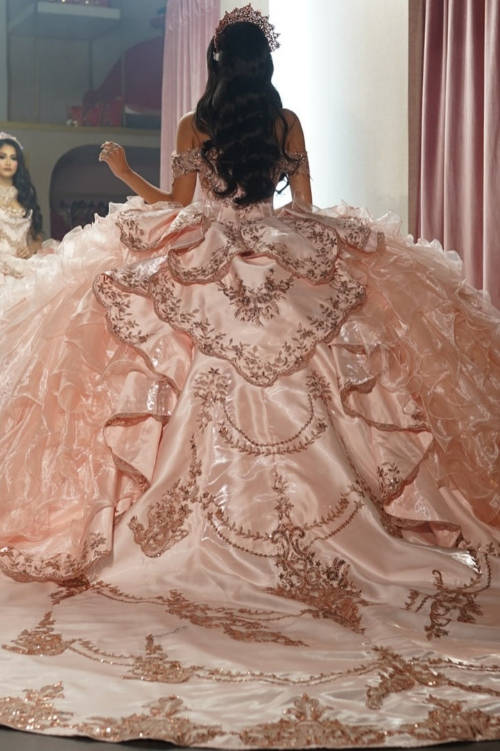 Description: Celebrate your quinceañera in timeless elegance with this stunning pink gown. Featuring an off-shoulder neckline and sleeveless silhouette, the dress showcases intricate beaded appliques and delicate ruffles that create dimensional texture throughout. A charming bow knot detail adds a sweet, feminine touch to this show-stopping design. Perfect for your special milestone, this dress combines classic sophistication with youthful charm, ensuring you'll feel confident and radiant on your unforgettable evening.