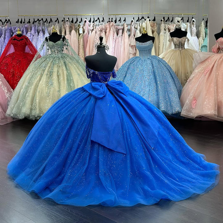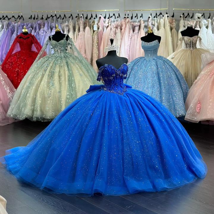 WQ1372 - Vestido de quinceañera de tul azul real brillante, sin mangas, con hombros descubiertos, plisado, lazo con cuentas y cordones, para fiesta de cumpleaños de 16 años