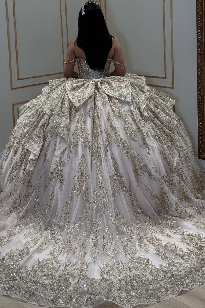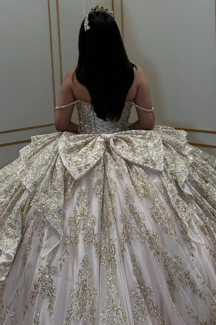 Off Shoulder Sleeveless Beaded Ruffles Bow Knot Gold Sweet 15 Quinceañera Dress WQ1730