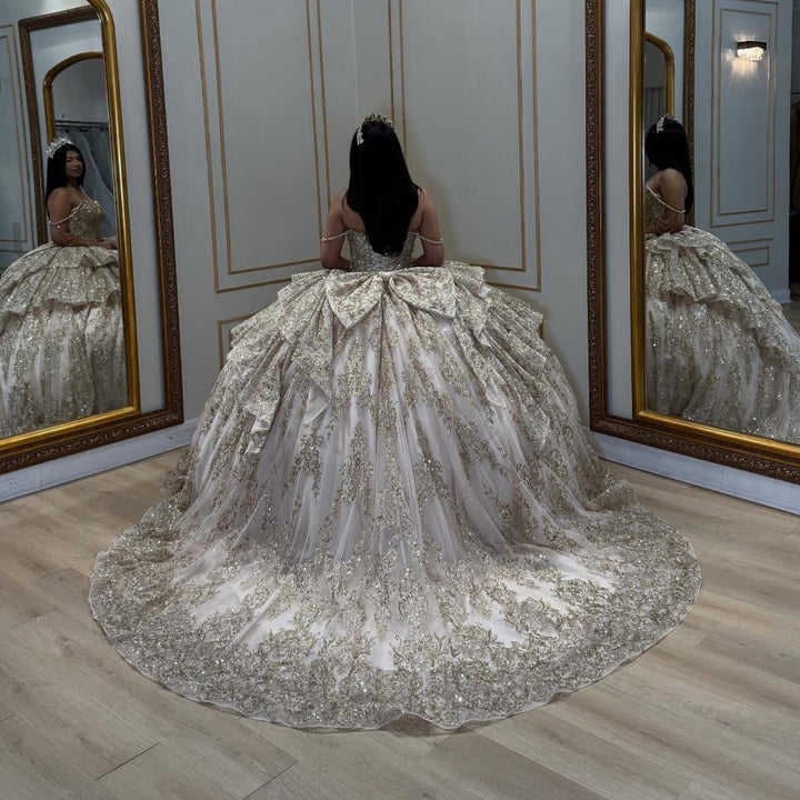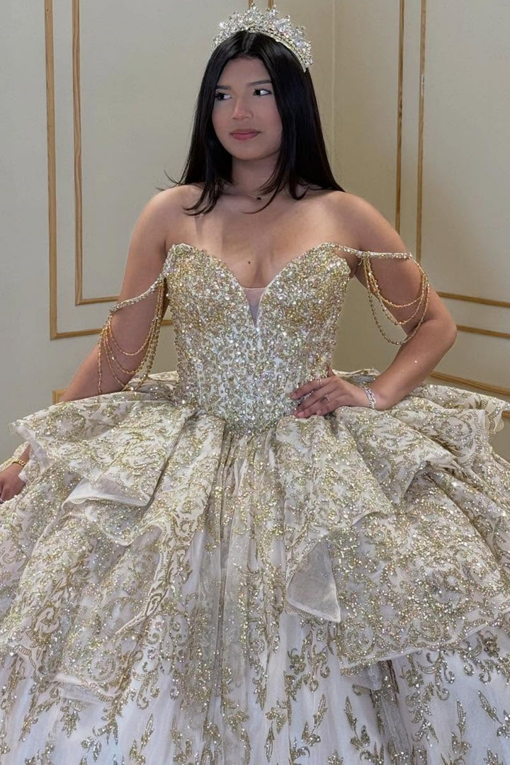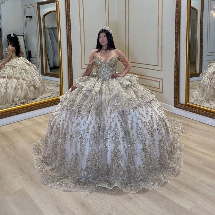Description: Celebrate your quinceañera in timeless elegance with this stunning off-shoulder gown. Crafted with meticulous attention to detail, this dress features delicate beading throughout, voluminous ruffled layers, and a charming bow knot accent that captures the essence of this milestone moment. The sleeveless design showcases the shoulders while the luxurious gold fabric creates a radiant, sophisticated look. Perfect for creating unforgettable memories on your special day, this Sweet 15 dress combines classic femininity with contemporary style, ensuring you feel confident and beautiful as you celebrate this cherished tradition.