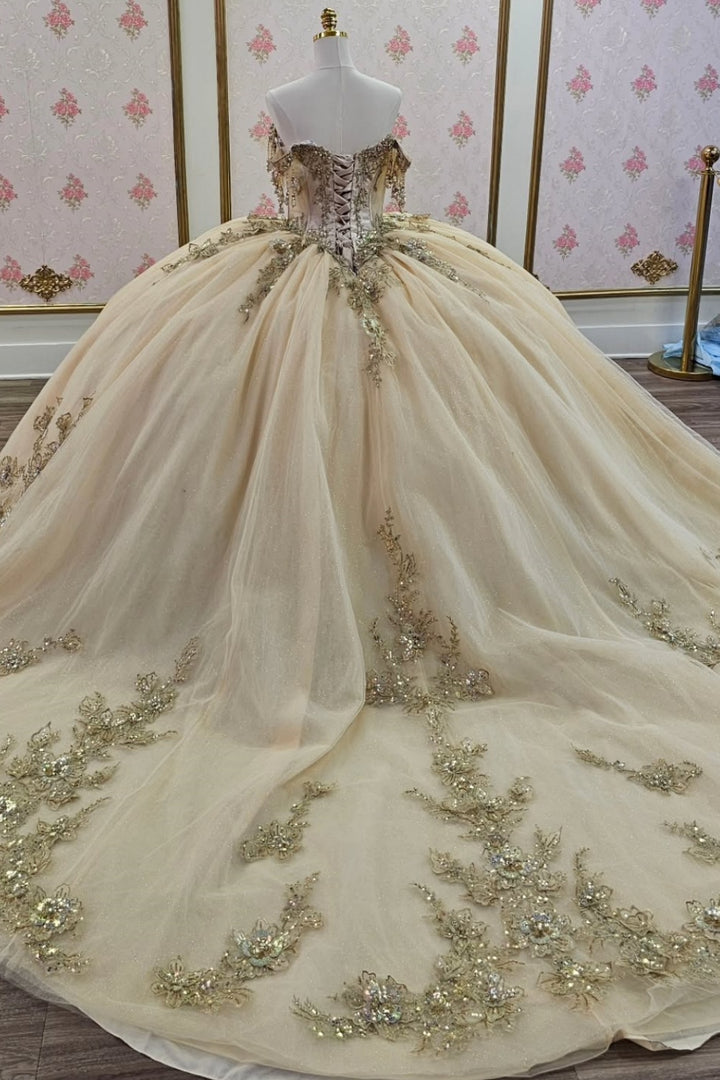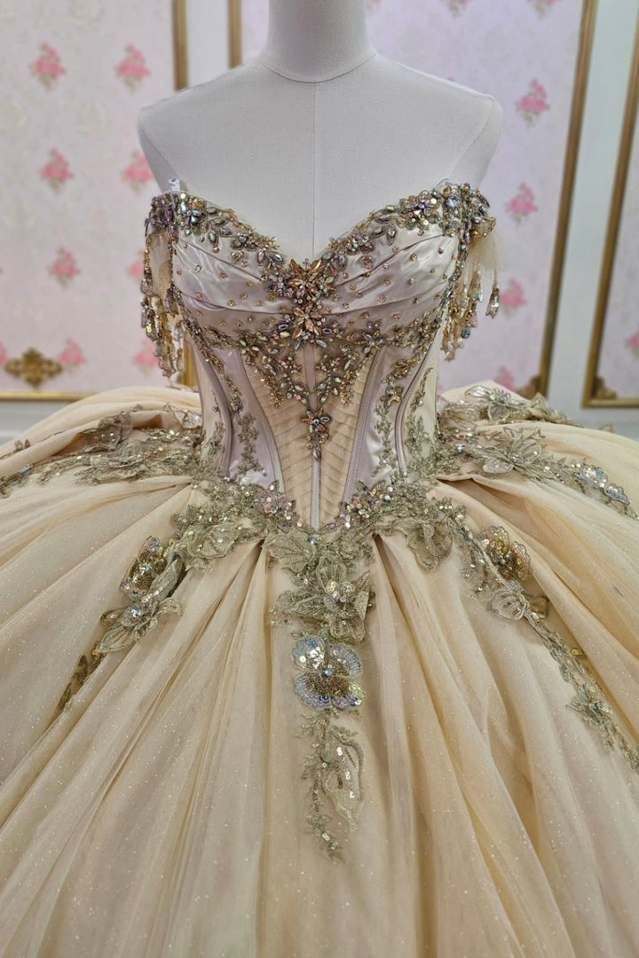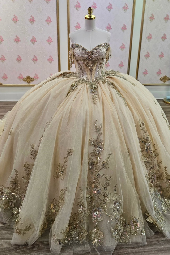 Off Shoulder Sleeveless Beaded Sequins Appliques Champagne Quinceañera Dress WQ1666