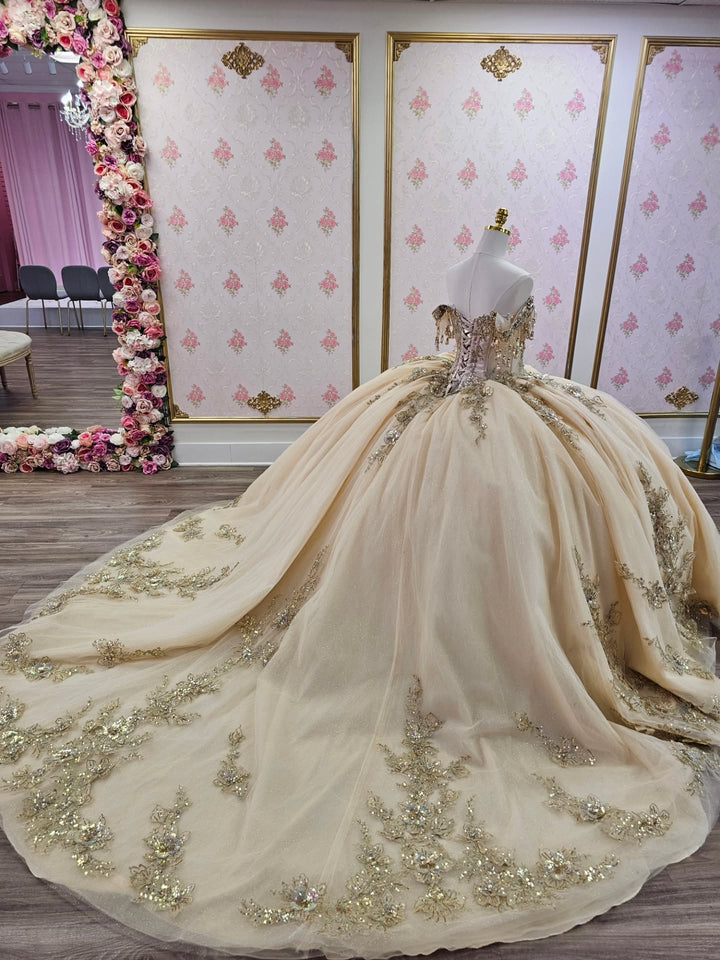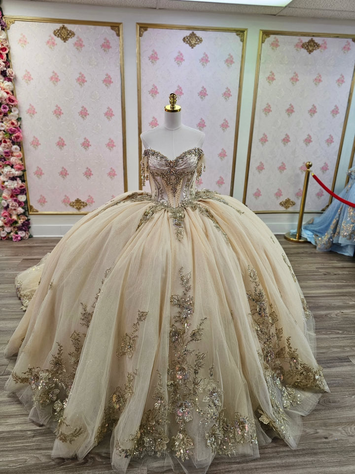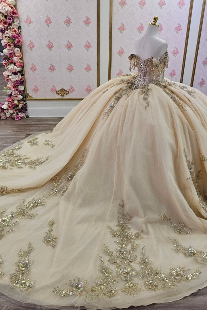 Description: This champagne-colored quinceañera dress features an off-shoulder, sleeveless design adorned with intricate beaded sequin appliques that catch the light beautifully. The delicate embellishments add texture and elegance, creating a refined silhouette perfect for a distinguished celebration. Designed to combine comfort with sophistication, this dress ensures a graceful and memorable appearance for your special day.