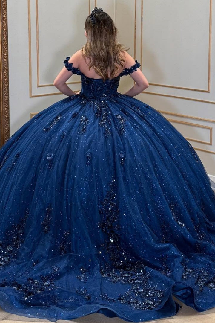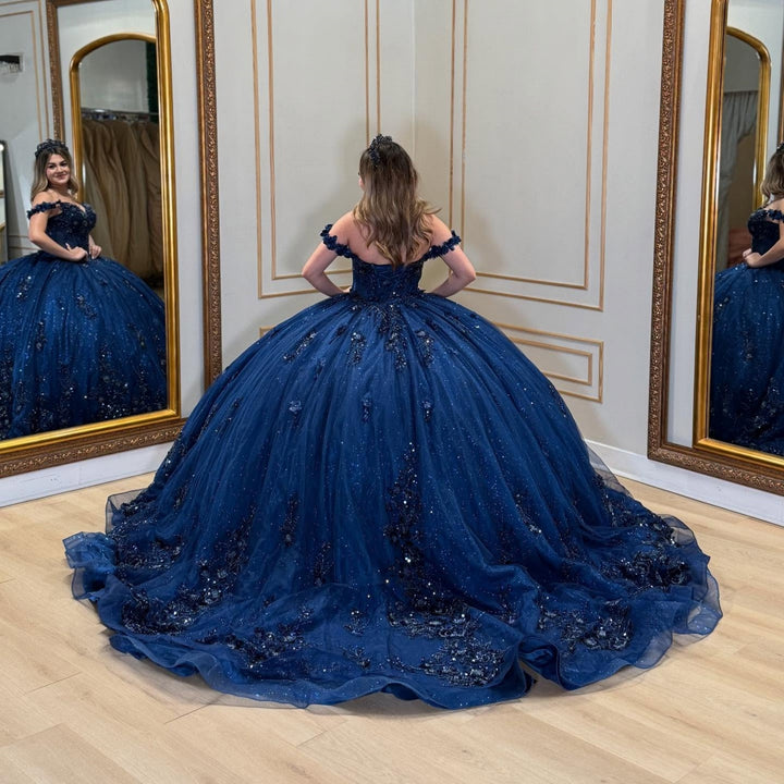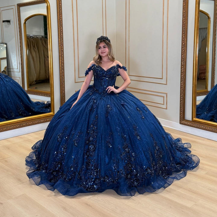 Description: Celebrate your quinceañera in timeless elegance with this stunning navy blue gown. Featuring an off-shoulder neckline and sleeveless silhouette, the dress showcases intricate beaded embellishments, shimmering sequins, and delicate appliqués that catch the light beautifully. The glitter accents add a touch of glamour and sophistication, making this the perfect choice for your Sweet 15 milestone. Expertly crafted for a memorable celebration, this dress combines classic style with contemporary sparkle.