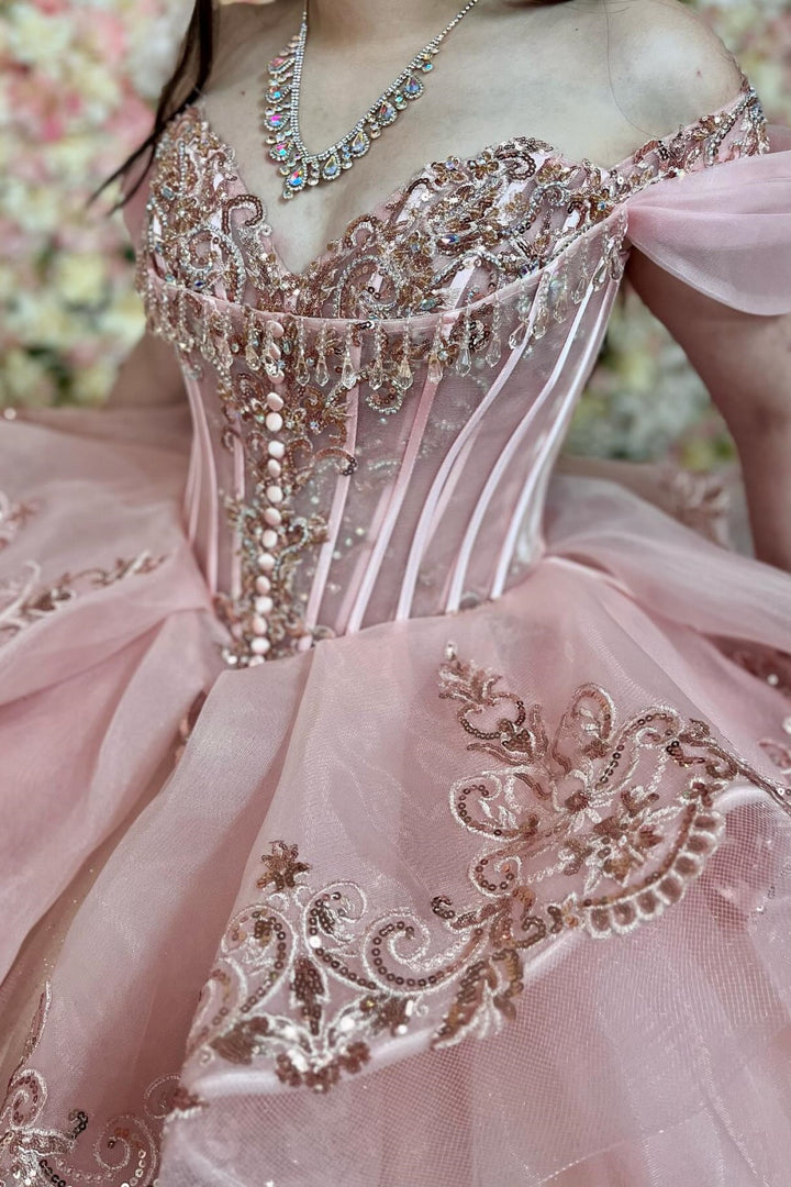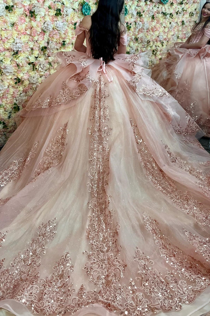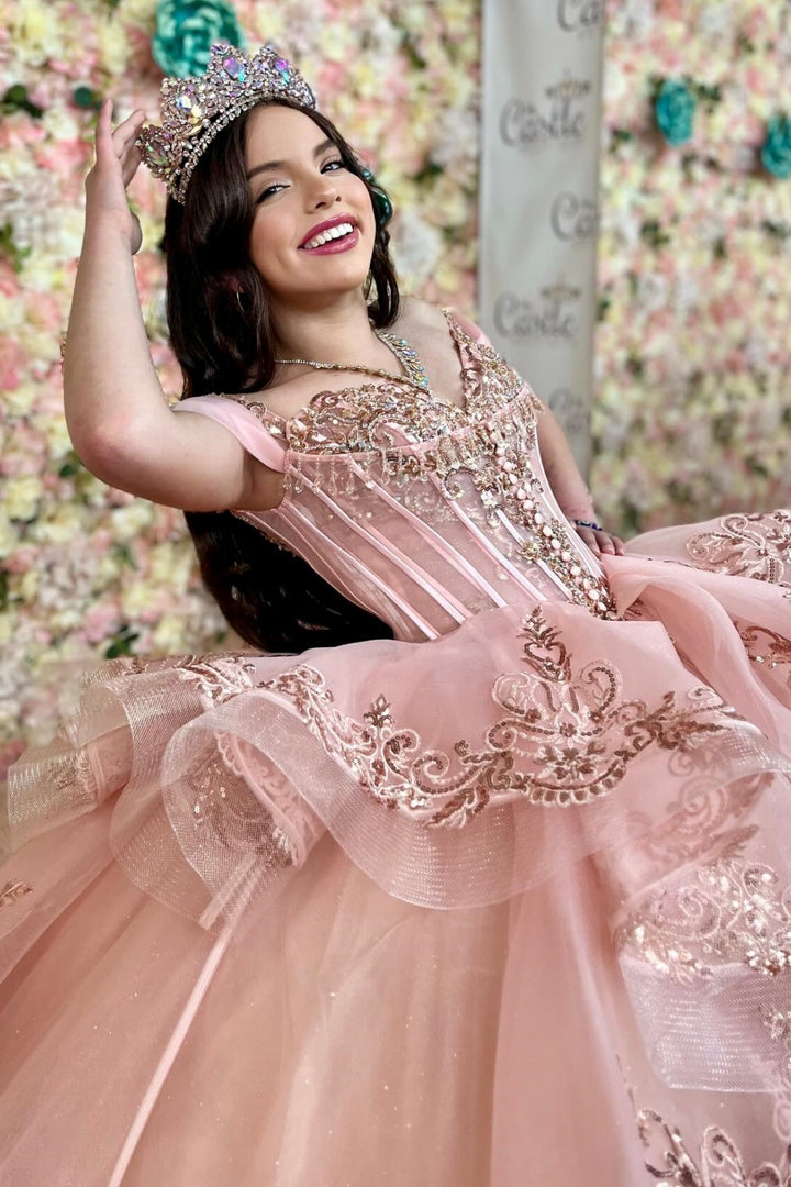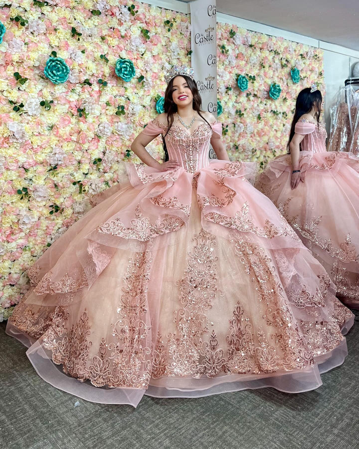 Description: Celebrate your quinceañera in timeless elegance with this stunning off-shoulder gown. Crafted with meticulous attention to detail, this dress features luxurious beaded embellishments and shimmering sequins that catch the light beautifully. Delicate appliqués and voluminous ruffles create dimension and movement, while the sleeveless design showcases your shoulders gracefully. The soft pink hue evokes romance and sophistication, making this the perfect choice for your milestone celebration. This show-stopping piece combines traditional quinceañera glamour with contemporary design elements, ensuring you'll feel confident and radiant throughout your special day.
