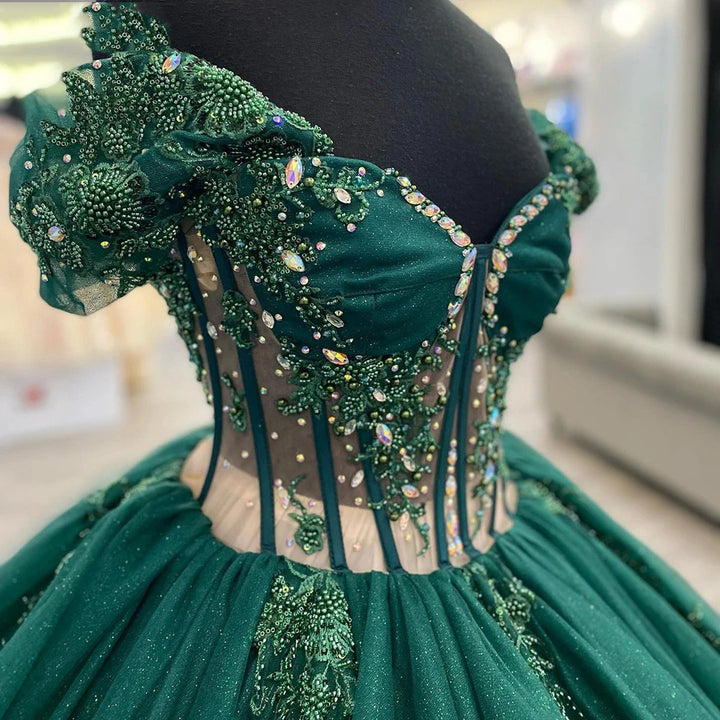 WQ1085 - Elegante vestido de fiesta con hombros descubiertos, apliques de encaje floral, cola larga, tul verde esmeralda, vestido de quinceañera, vestido de princesa para dulces 16