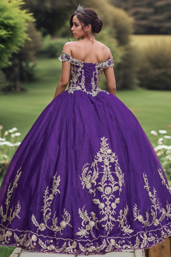 Descripción: Disfrute del lujo con el vestido de quinceañera WQ1293. Mangas con hombros descubiertos, delicados apliques florales dorados y un impresionante tul morado oscuro se combinan para crear un look sofisticado y atemporal. La espalda con cordones le da un ajuste perfecto, lo que lo convierte en la opción ideal para su fiesta de quinceañera.