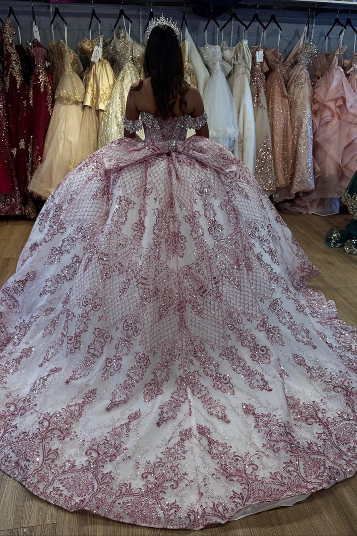 Description: Celebrate your quinceañera in timeless elegance with this stunning off-shoulder gown. Featuring a sleeveless silhouette with delicate pleating and intricate beadwork, the dress showcases a charming bow knot detail at the bodice. The shimmering pink glitter fabric catches light beautifully, creating an enchanting sparkle throughout the evening. Perfect for making a memorable entrance at your special milestone, this dress combines sophisticated design with youthful glamour for an unforgettable celebration.