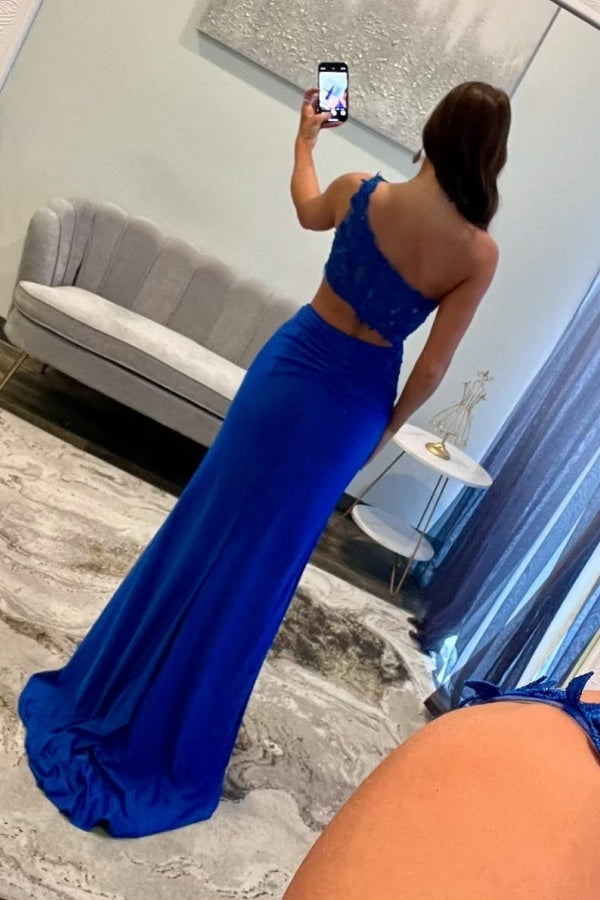 WU1243 - Vestido de fiesta clásico de un solo hombro, sin mangas, con apliques de encaje, abertura lateral alta y cola.