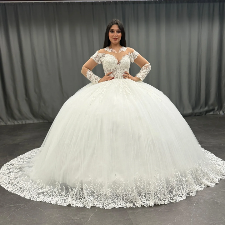 WQ1331 - Vestido de fiesta formal de noche, escote redondo, mangas largas transparentes, apliques de encaje, plisado, de tul blanco, para quinceañeras, cumpleaños y dulces 16