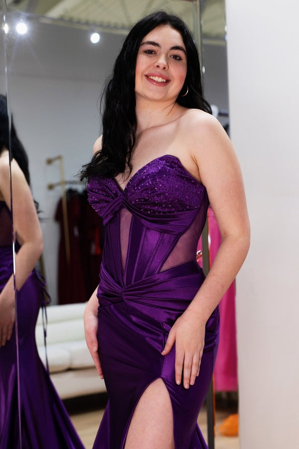 WU1413 - Elegante vestido de noche formal, sin tirantes, sin mangas, con cuentas, plisado, abertura lateral alta y cola, vestido de fiesta de graduación y cóctel.