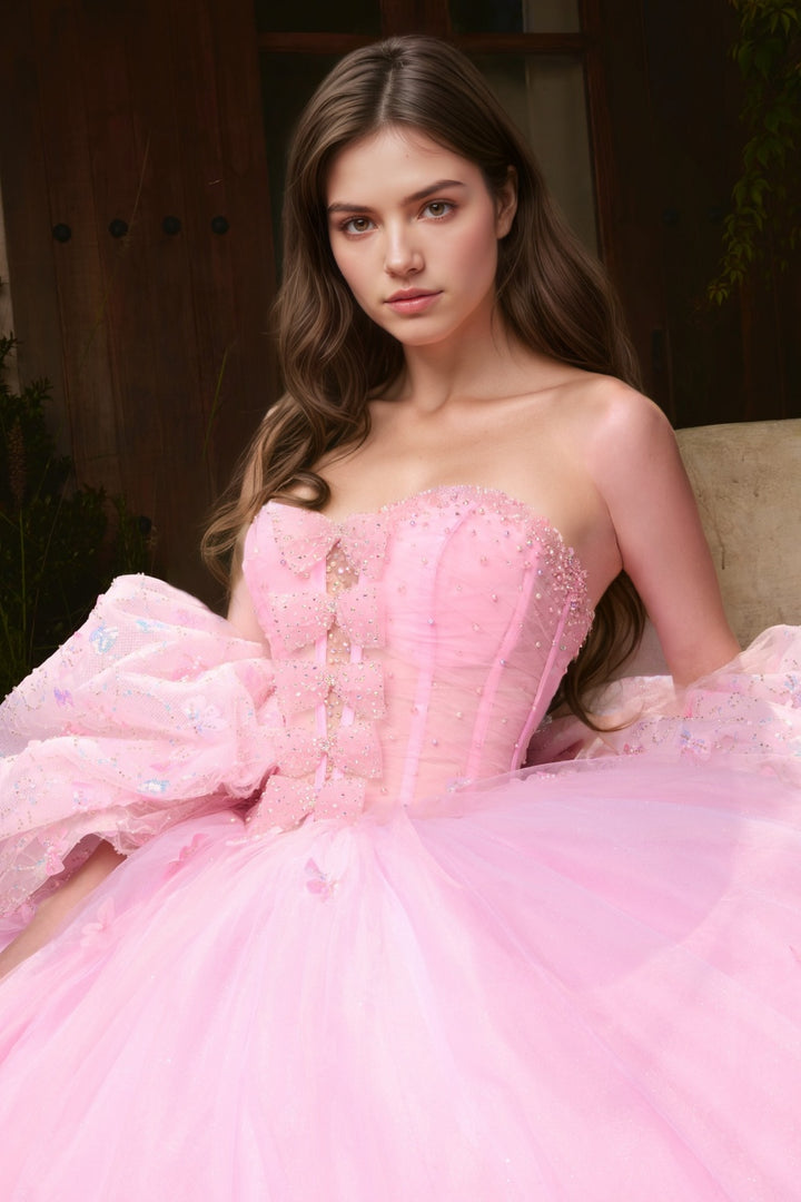 Strapless Short Sleeves Pleated Beaded Ruffles Bow Knot Pink Tulle Sweet 15 Quinceañera Dress WQ1705