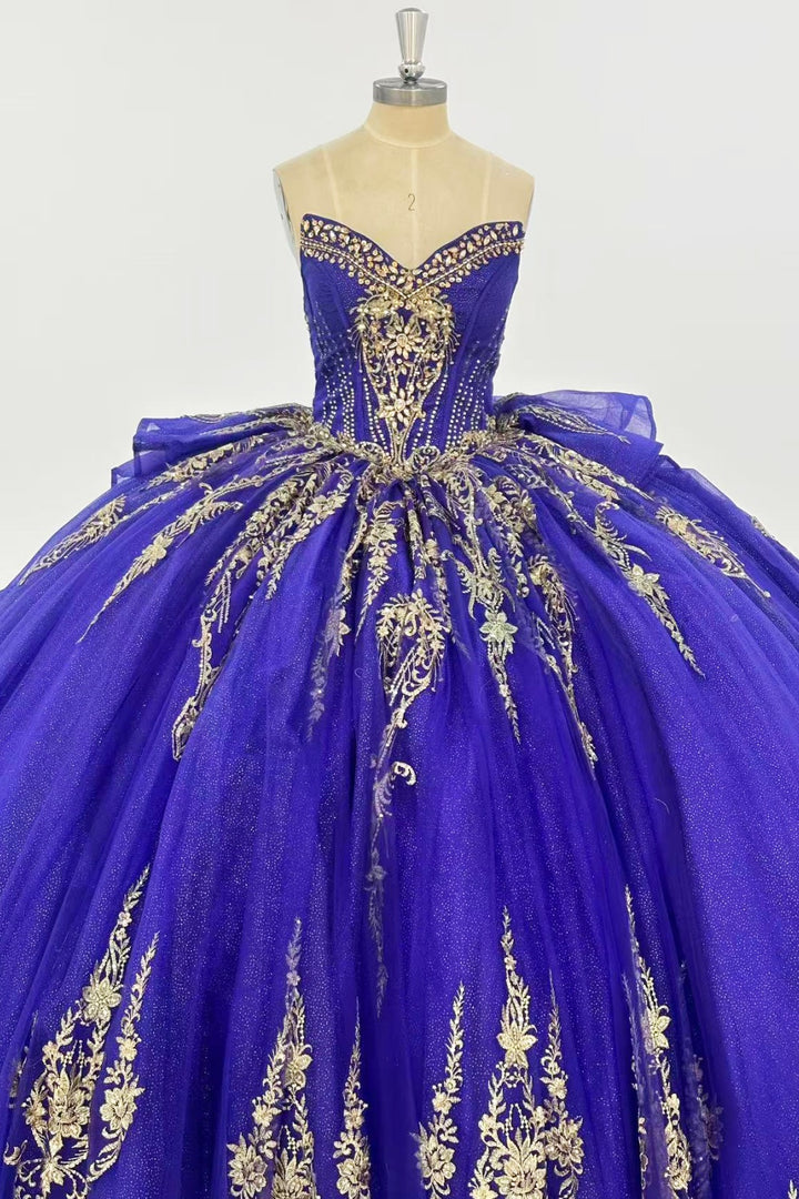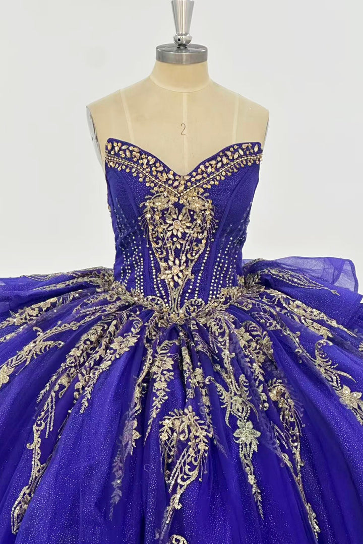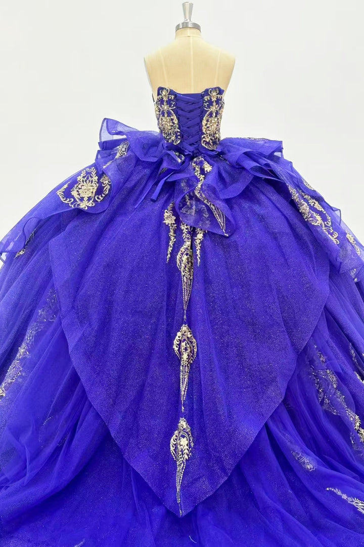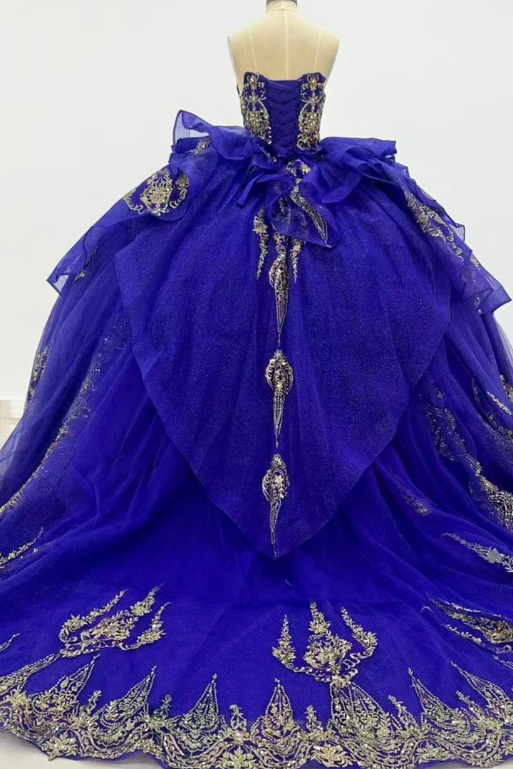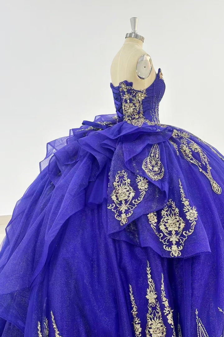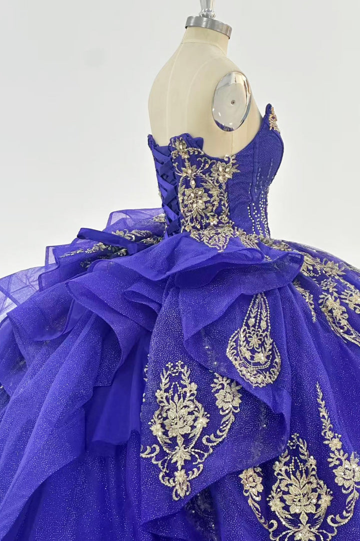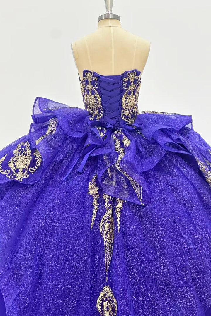 Description: This exquisite Sweet 15 gown showcases a strapless silhouette that exudes timeless elegance and sophistication. The sleeveless bodice is adorned with lustrous gold sequins and carefully placed appliqués that create a luxurious, eye-catching effect. Cascading ruffles and tiered layers build dimension throughout the skirt, offering movement and grace with every step. The deep purple coloring provides a rich, jewel-toned backdrop that enhances the brilliance of the embellishments. Expertly crafted for your milestone celebration, this dress combines classic quinceañera tradition with refined detailing, ensuring you'll feel confident and radiant on your special day.