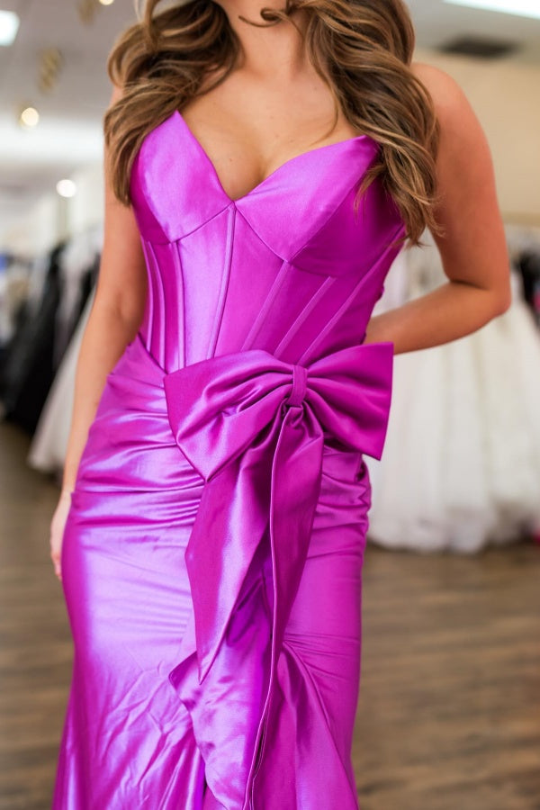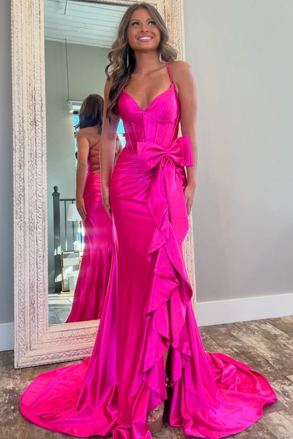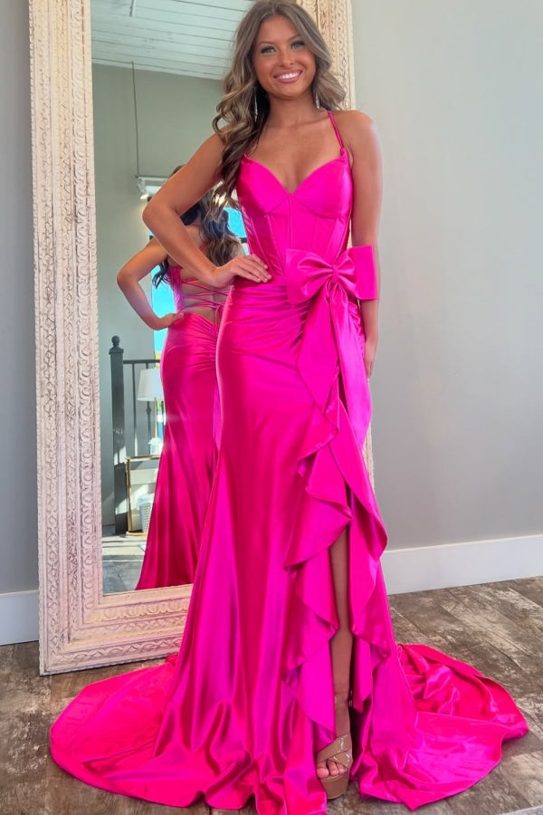 WU1023 - Vestido de fiesta sexy y atractivo, sin tirantes, sin mangas, plisado, con lazo, volantes, tirantes cruzados, espalda abierta, abertura lateral, largo hasta el suelo.