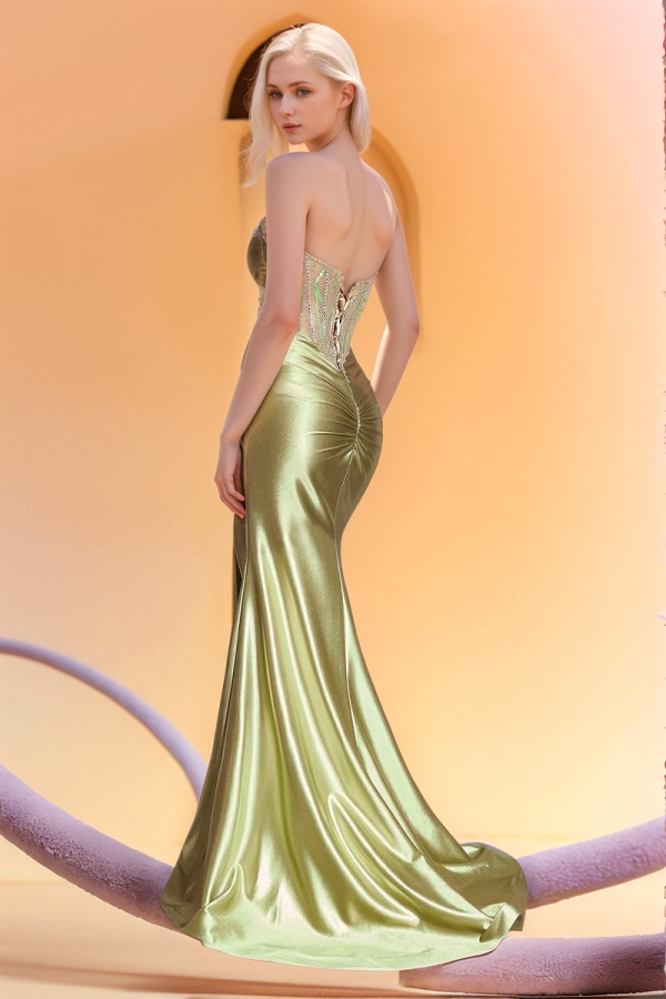WU1163 - Vestido de fiesta de graduación con escote en V, tirantes finos, purpurina, sin tirantes, con cuentas de cristal, plisado, abertura lateral alta y cola.