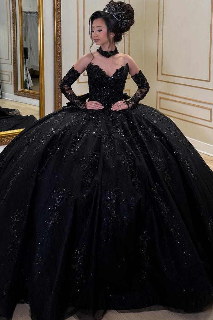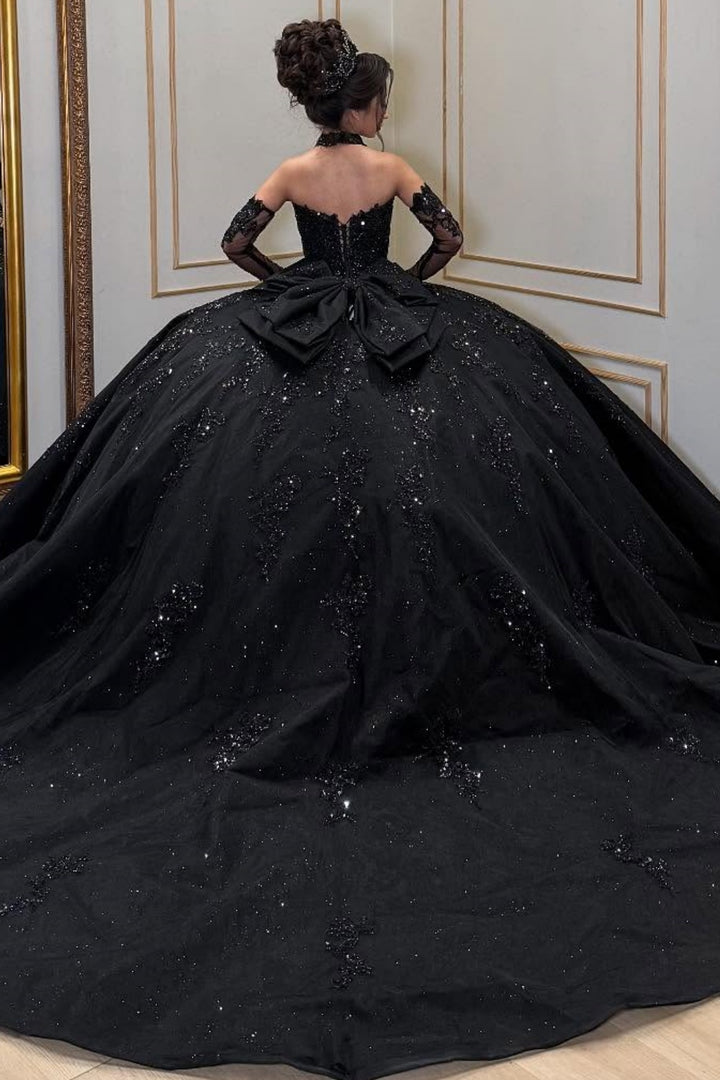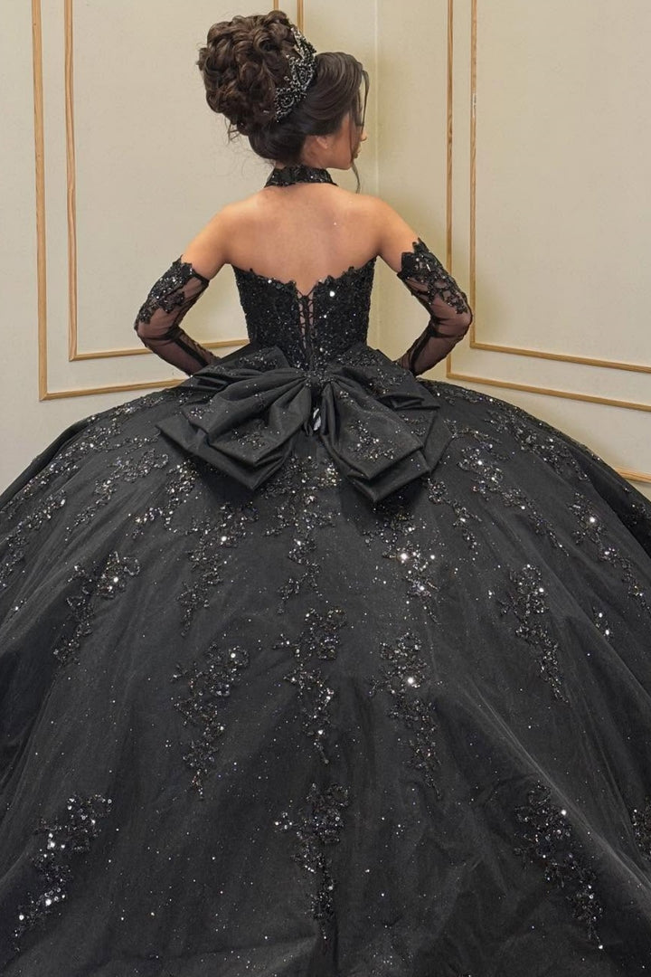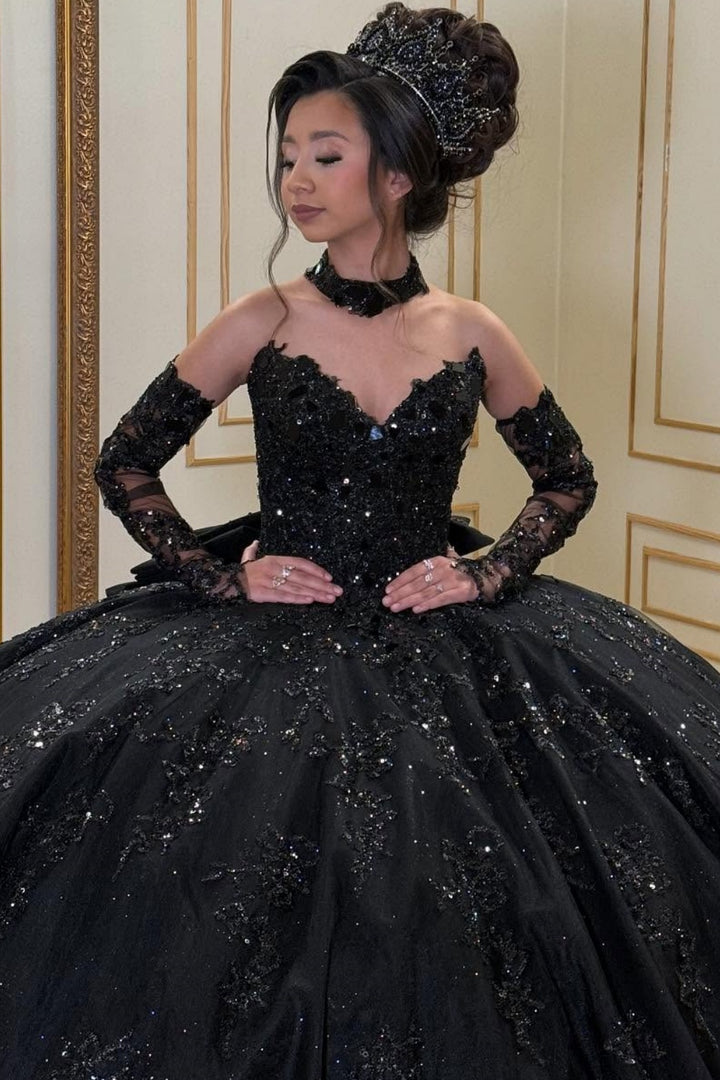 V Neck Sleeveless Sequins Beaded Appliques Bow Knot Black Sweet 15 Quinceañera Dress WQ1700