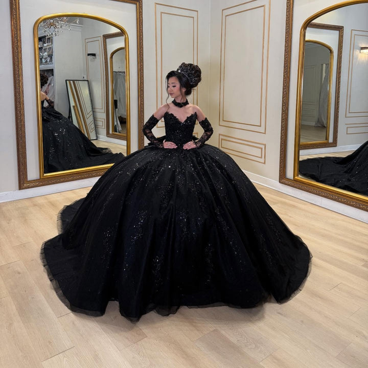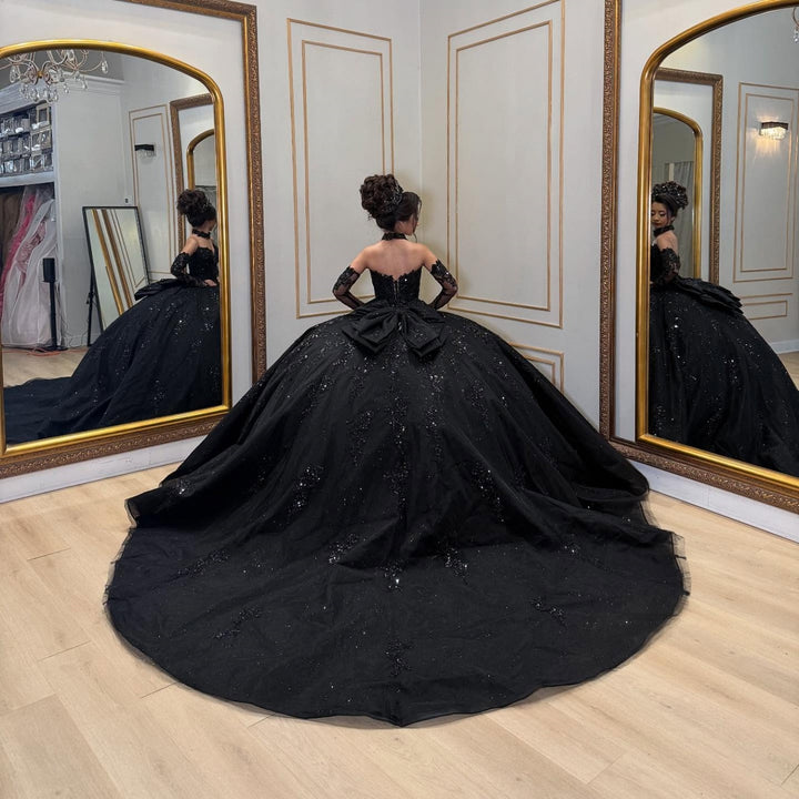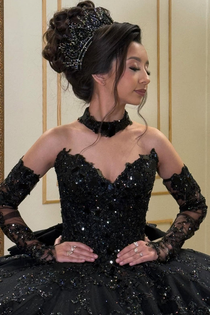 Description: Make a stunning entrance at your quinceañera in this sophisticated black gown. Featuring an elegant V-neckline and sleeveless silhouette, the dress showcases intricate sequin and bead embellishments throughout, complemented by delicate appliqués and a charming bow knot detail. The luxurious beadwork creates a dazzling effect that catches light beautifully, ensuring you'll be the center of attention. Perfect for celebrating this milestone moment with timeless elegance and modern flair.