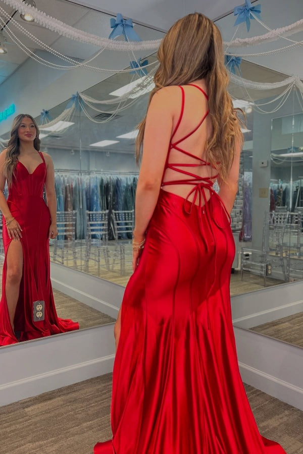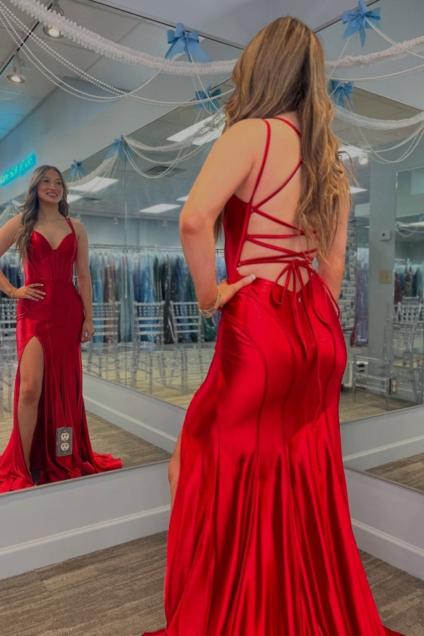 WU1113 - Vestido de fiesta informal, sencillo, con escote en V, sin tirantes finos, largo hasta el suelo, tirantes cruzados, abertura lateral alta y cola.