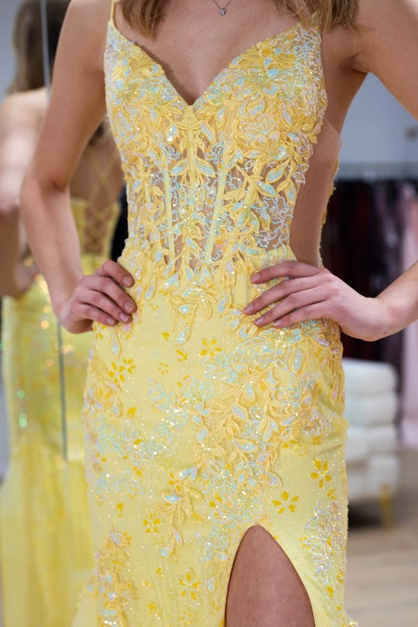 WU1383 - Vestido de noche con escote en V, tirantes finos, sin mangas, plisado, con apliques de lentejuelas, abertura lateral alta y cola, espalda descubierta