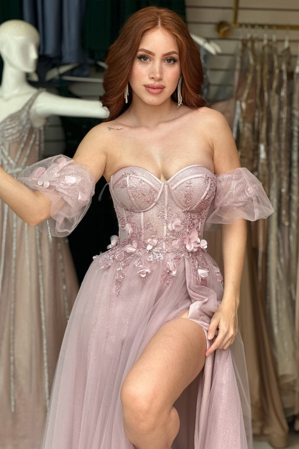 A-Line Off Shoulder Half Lantern Sleeves 3D Flowers High Side Slit Prom Dress WU1052
