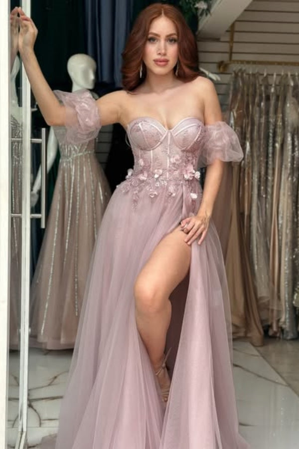 Description: This stunning and feminine WU1052 prom dress features a flattering A-line silhouette with an off-shoulder neckline and half lantern sleeves. The 3D flowers on the dusty pink tulle fabric add a touch of elegance, while the high side slit adds a modern and playful element. Perfect for formal parties, weddings, or as a wedding guest dress.
