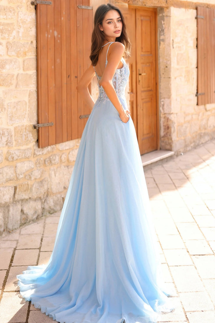 A-Line V Neck Saghetti Straps Sleeveless Appliques High Side Slit and Train Prom Dress WU1559