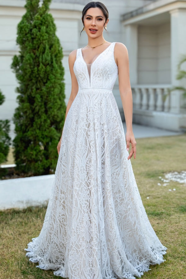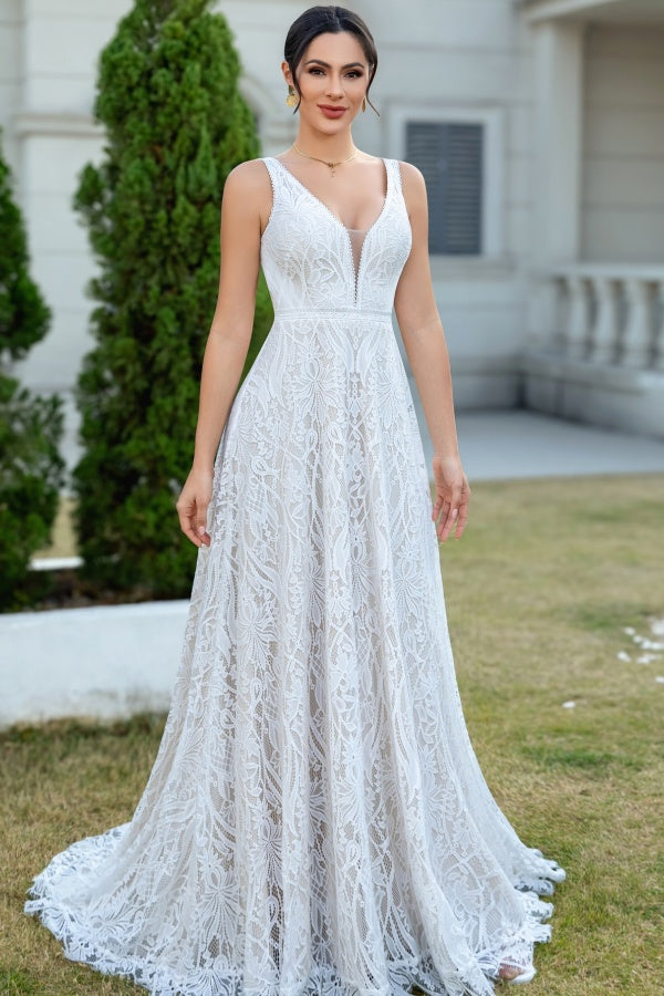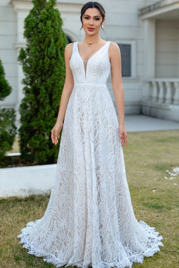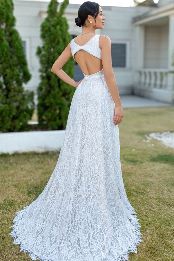 A-Line V Neck Straps Lace Open Back Boho Wedding Dress WW1049