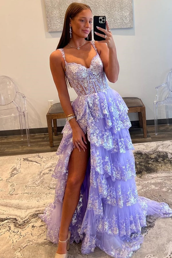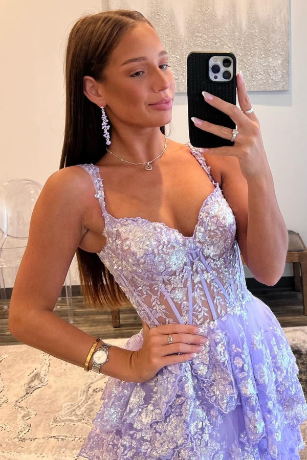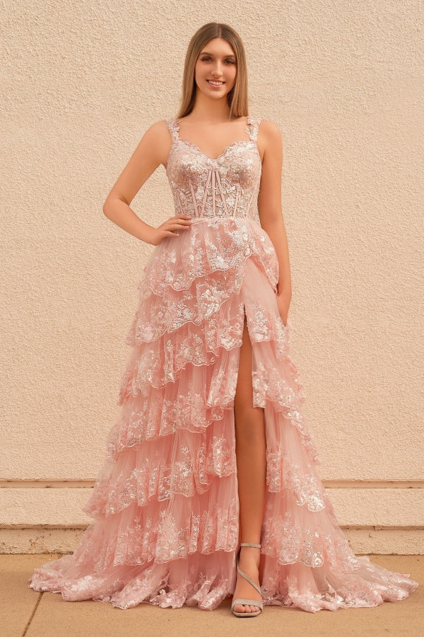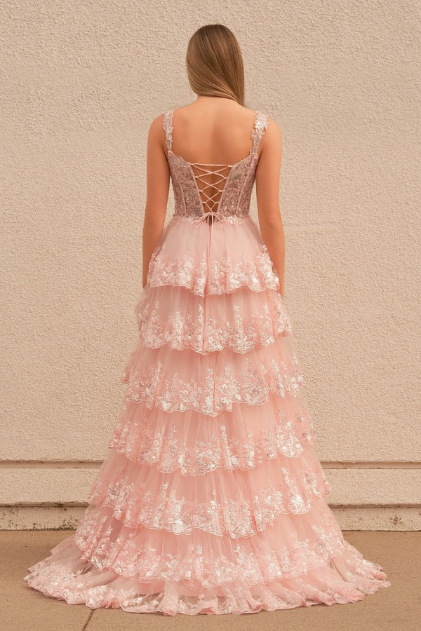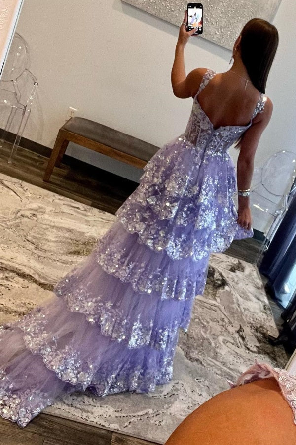 A-Line V Neck Straps Lace Sequins Appliques Tiered Prom Dress WU1223