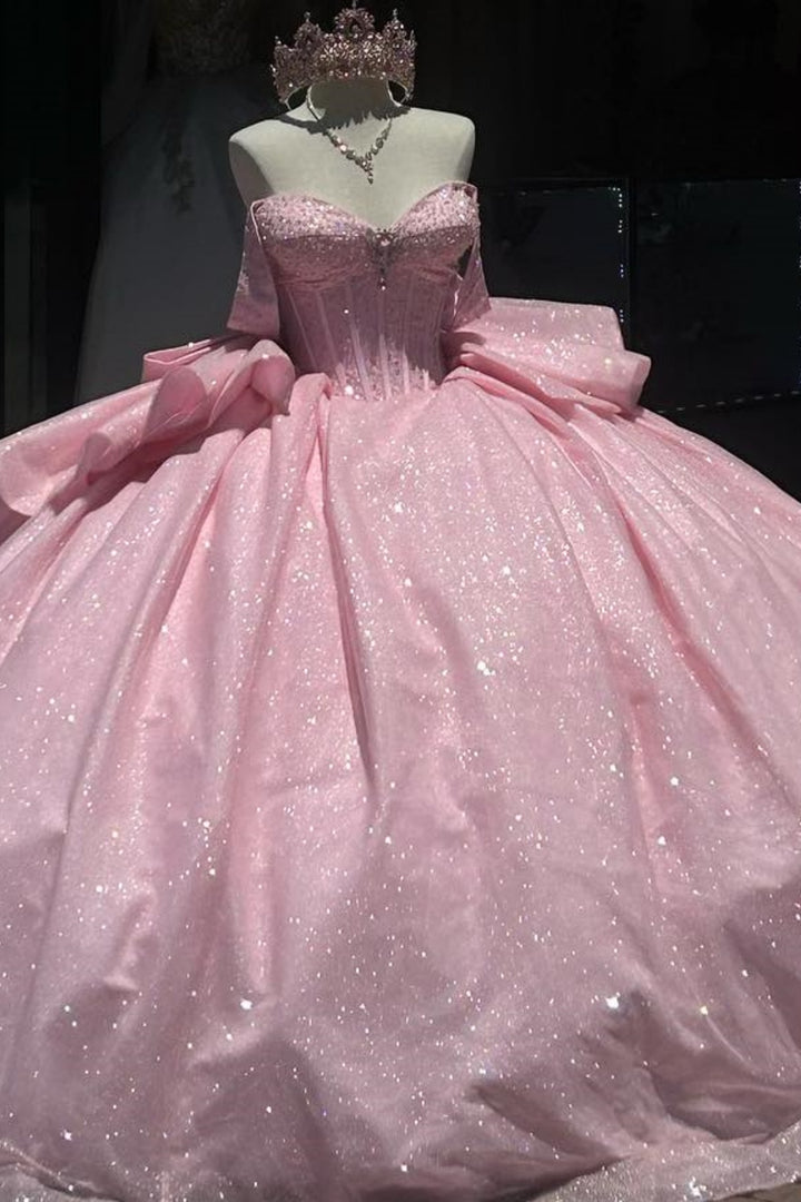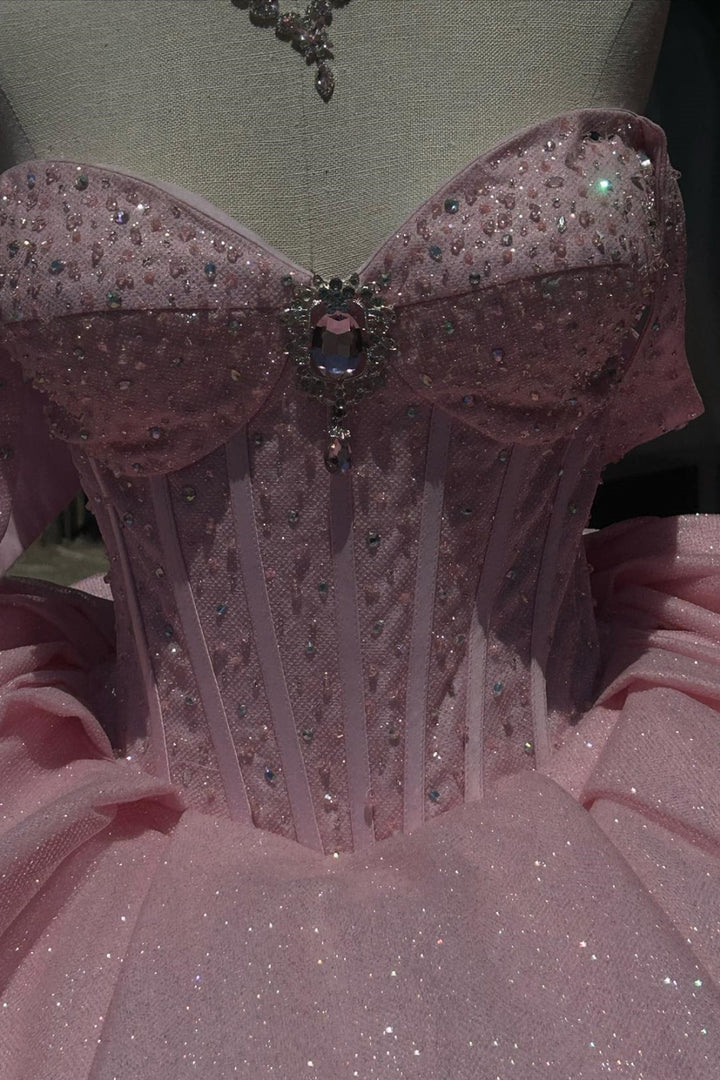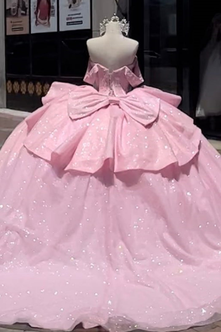 Off Shoulder Sleeveless Beaded Ruffles Bow Knot Pink Sweet 15 Quinceañera Dress WQ1639