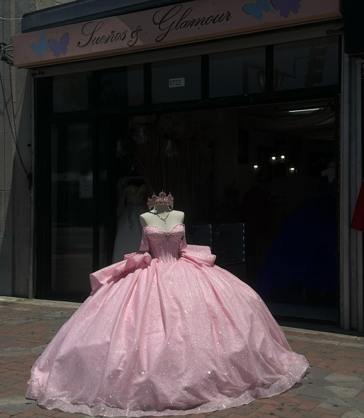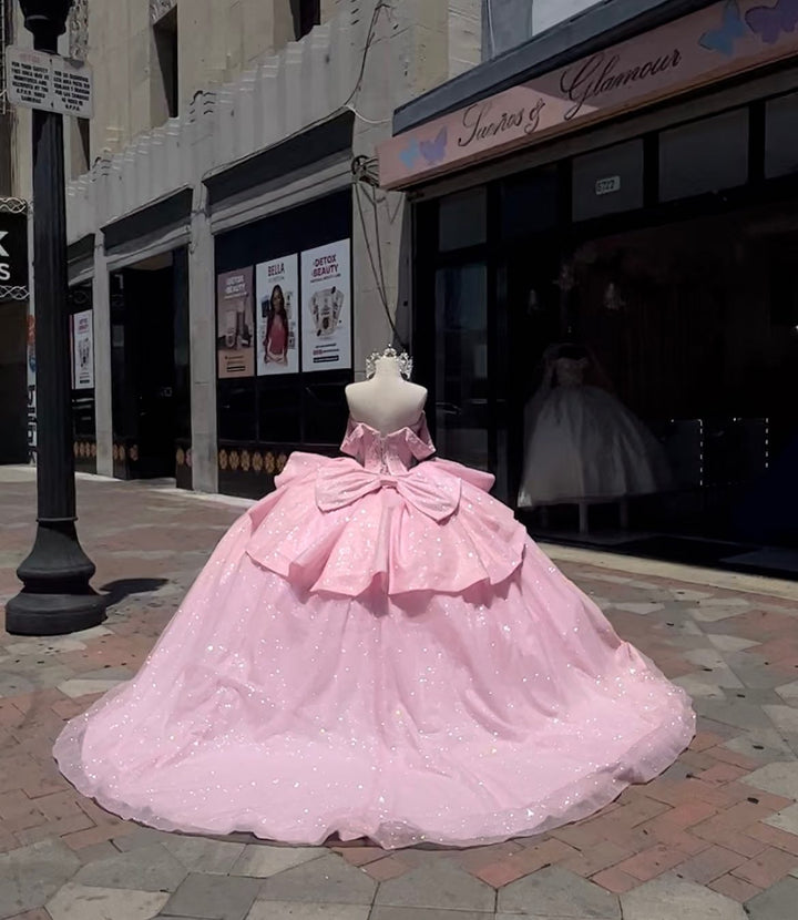 Description: This stunning pink quinceañera dress showcases an off-shoulder, sleeveless silhouette embellished with delicate beadwork and soft ruffles. A graceful bow knot accentuates the waist, adding a refined and youthful detail. Designed for a Sweet 15 celebration, this dress blends elegance and charm, ensuring a memorable and sophisticated appearance for this special occasion.