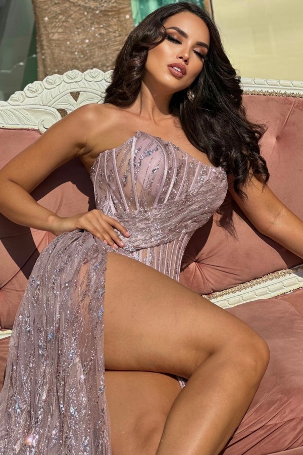 Boat Neck Sequins High Side Slit and Train Prom Dress WU1337