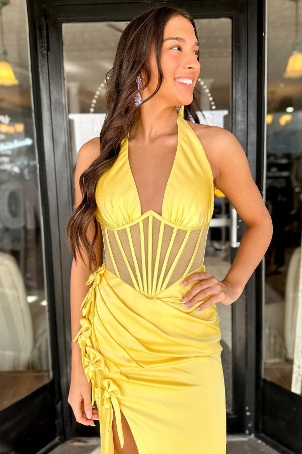 Low V Neck Halter Bow Knot High Side Slit and Train Prom Dress WU1180