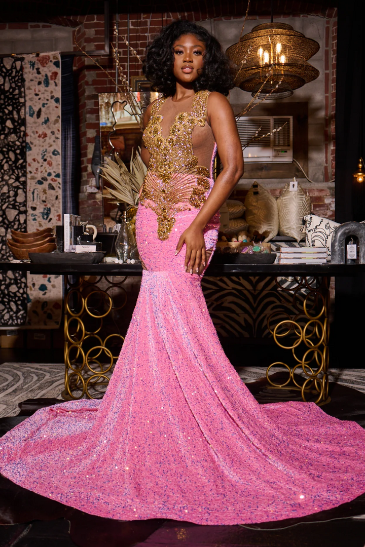 Description: This exquisite pink velvet prom dress features a mermaid silhouette that elegantly contours the body. Its sleeveless design with slender straps and a V-neckline creates a refined and flattering look. Embellished with gold beadwork and shimmering sequins, the dress offers a luxurious sparkle perfect for formal occasions. Crafted with expert attention to detail, it combines rich texture and sophisticated style to ensure you make a stunning statement.