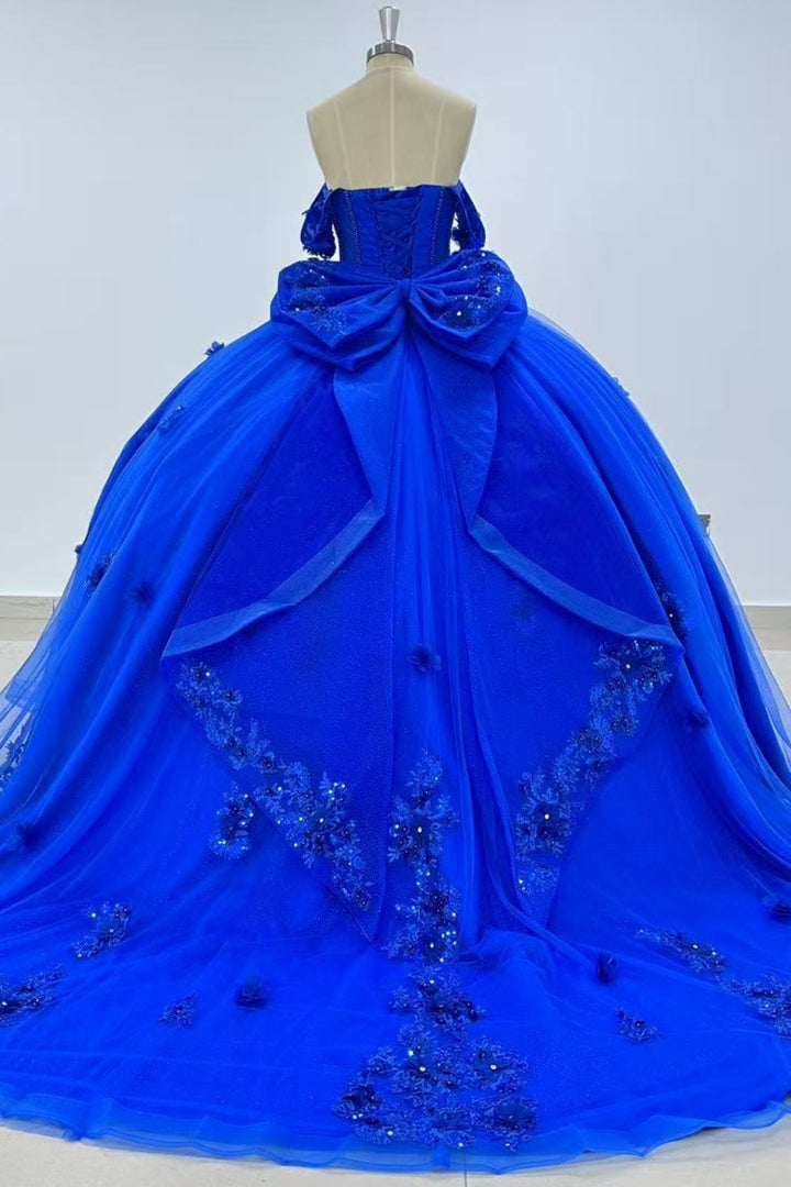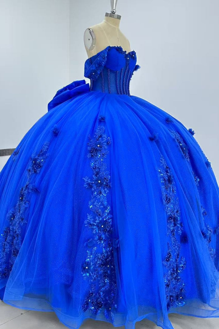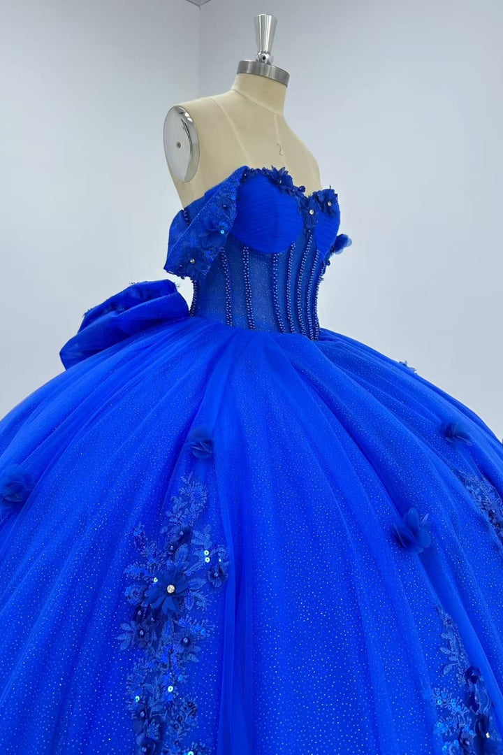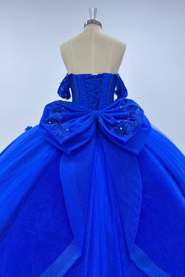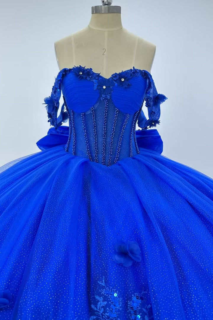 Description: This royal blue quinceañera dress features an off-shoulder, sleeveless design accented with intricate beaded appliques that add refined sparkle. A beautifully crafted bow knot at the waist enhances the silhouette, combining classic elegance with youthful sophistication, perfect for marking a special celebration.