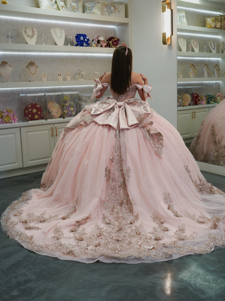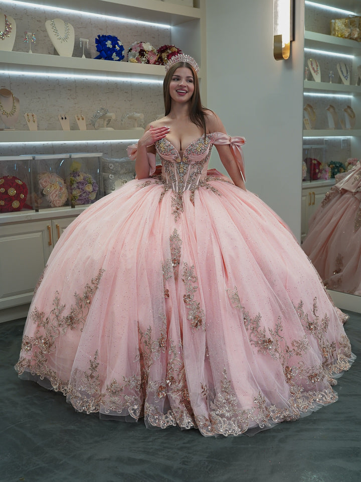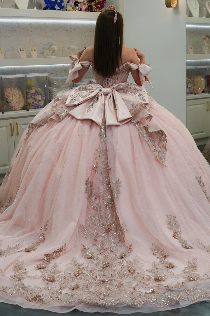 Description: This exquisite Off Shoulder Sleeveless Quinceañera dress features intricate beading and shimmering sequins that catch the light beautifully. The delicate bow knot detail adds a charming touch to its sparkly pink fabric, perfectly blending elegance with youthful sweetness. Designed for comfort and style, this dress ensures a memorable and radiant celebration on your special day.