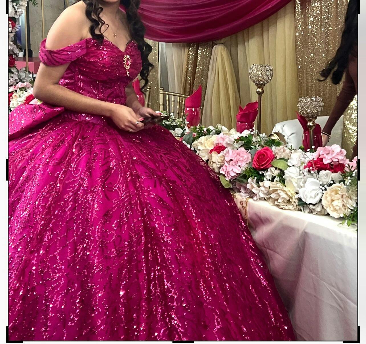 Description: This WQ1148 Quinceanera Dress is modern and chic with an off-shoulder sweetheart neckline and a beautiful hot pink tulle ball gown skirt. Perfect for any Sweet 16 or evening party, this dress will make you feel like a princess. Its elegant design and color will make you stand out in any occasion.
