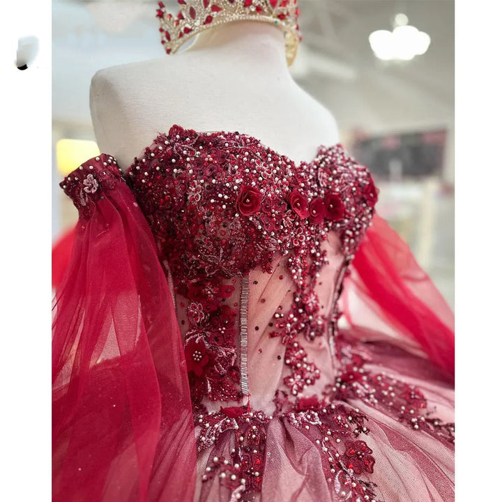 Off Shoulder Long Sleeves Beaded 3D Flower Appliques Burgundy Quinceanera Dress for Sweet 16 WQ1231